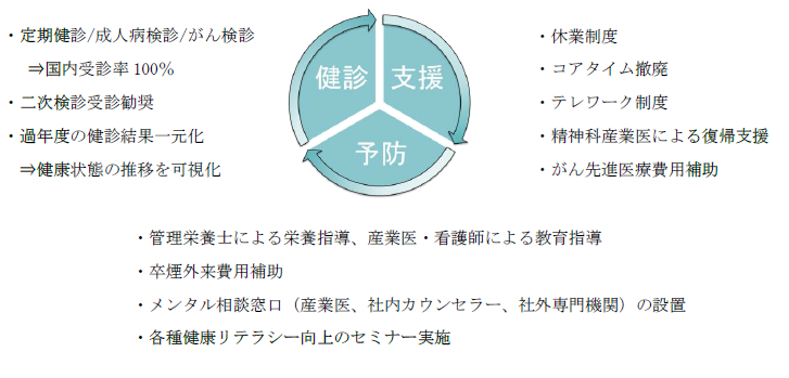 「予防」においては、生活習慣病対策として管理栄養士による栄養指導や禁煙外来受診費用の補助、社内外のメンタルヘルス専門家の起用、各種セミナーなどをおこなっています。