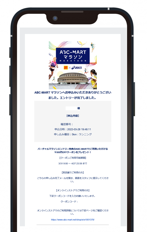 また、本イベントは2022年3月31日(木)9:00~4月25日(月)23:59にてエントリー期間を設け、エントリー特典として3月31日(木) ~4月27日(水) の期間で全国のABC-MART及びABC-MARTオンラインストアで使用できるasics製品の500円割引クーポンを提供します。