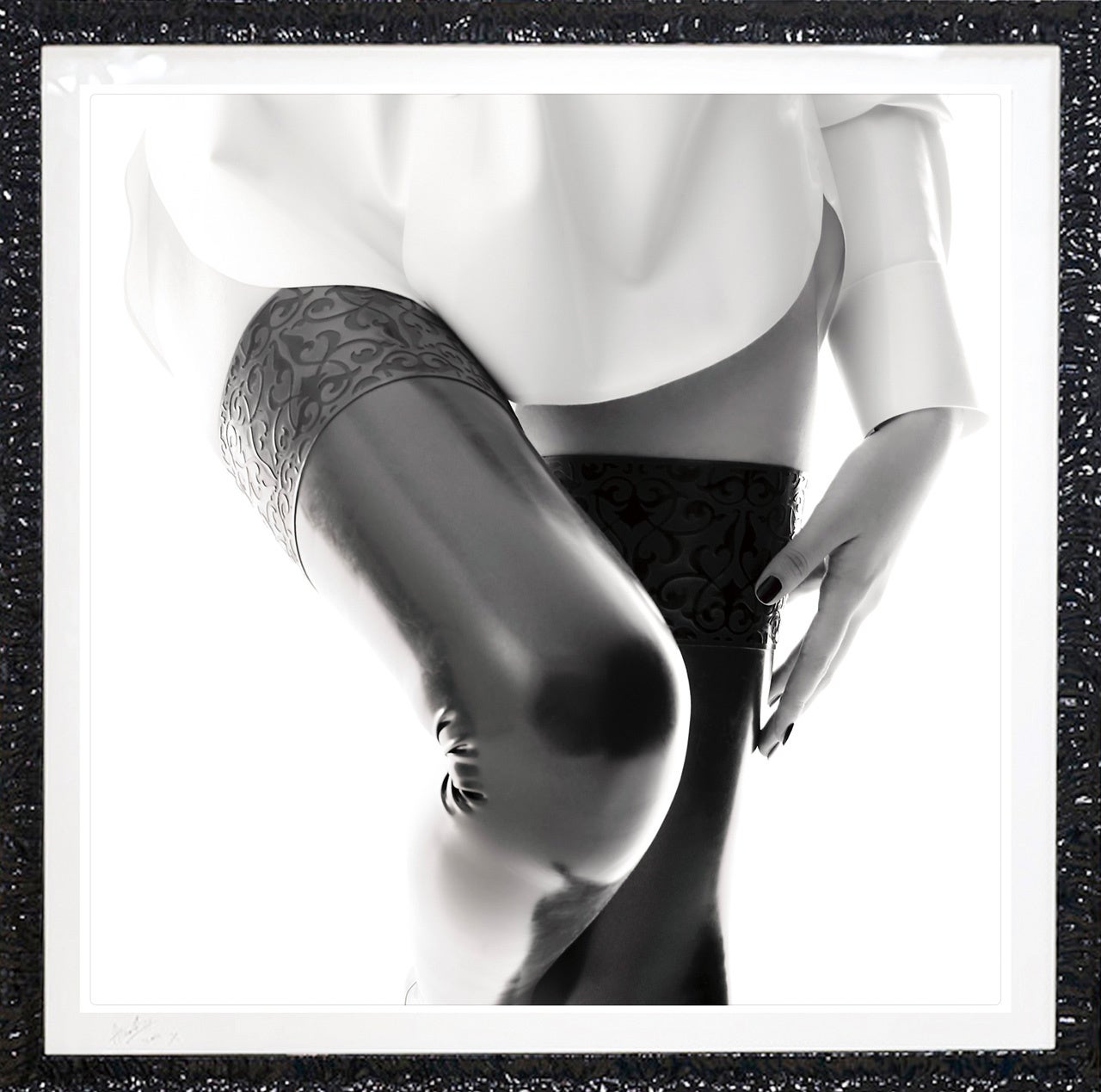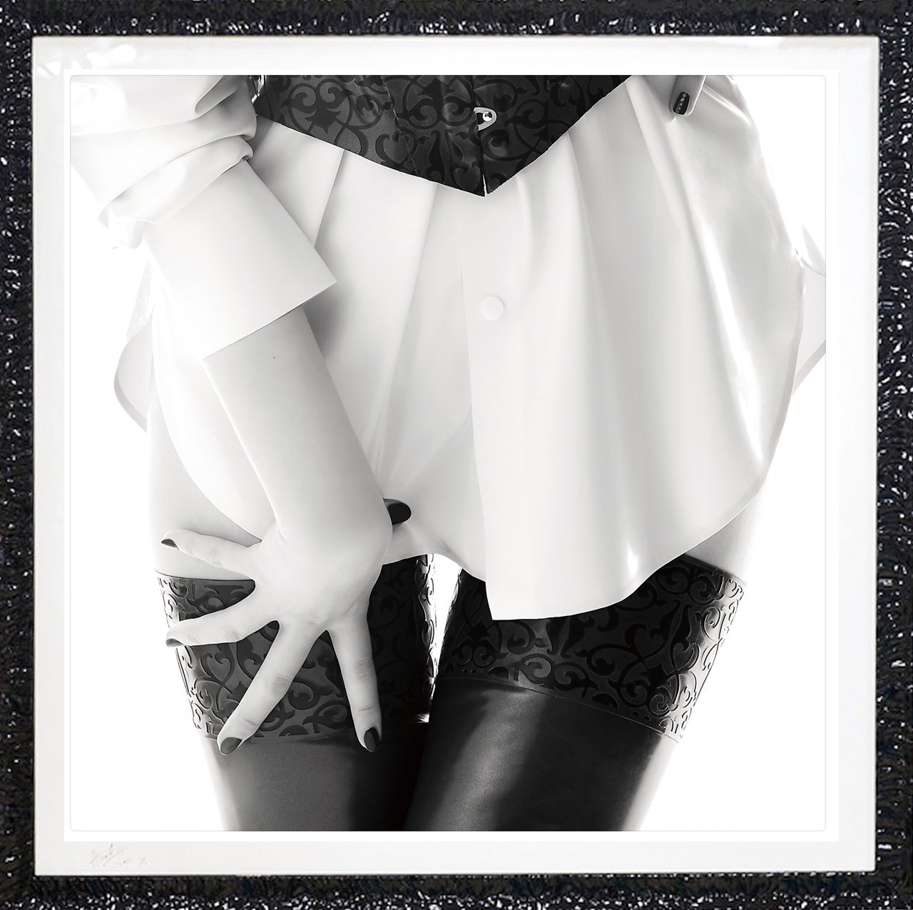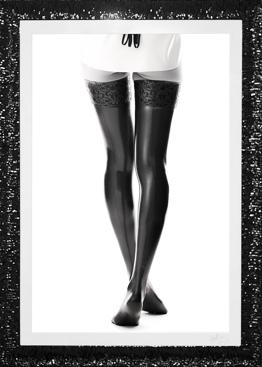 平塚が世界的に評価が高いラテックスブランド〈Kurage(クラゲ)〉のボンデージ作品と出会い、ラテックスラバーの独特の艶に魅了されたことをきっかけに制作された同シリーズ。黒色表現に優れる〈ライカ〉のカメラを手にし追求するモノクロームプリントのみならず、額装にもただならぬこだわりがあります。滑らかで温もりを感じる手触りの額縁に触れながら鑑賞するスタイルに、被写体と触れ合っているかの没入感が得られることでしょう。