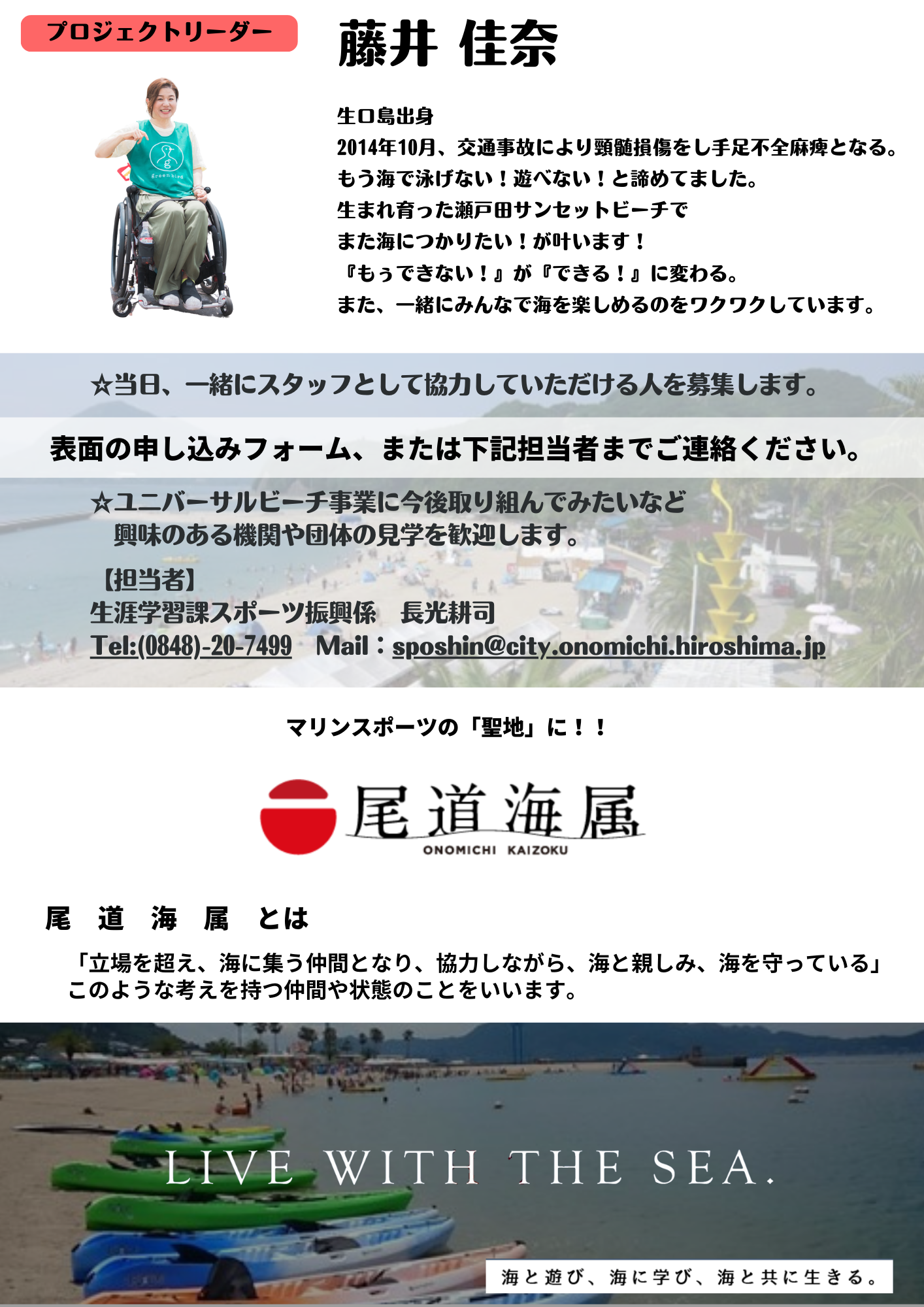 尾道市とのユニバーサルビーチの取り組みは2年目です。今年は、藤井さんという、強力なメンバーが加わり、今後、継続プロジェクトにしていくために重要な2年目!関わるメンバーが、力を合わせて安心して、楽しめるイベントにします。