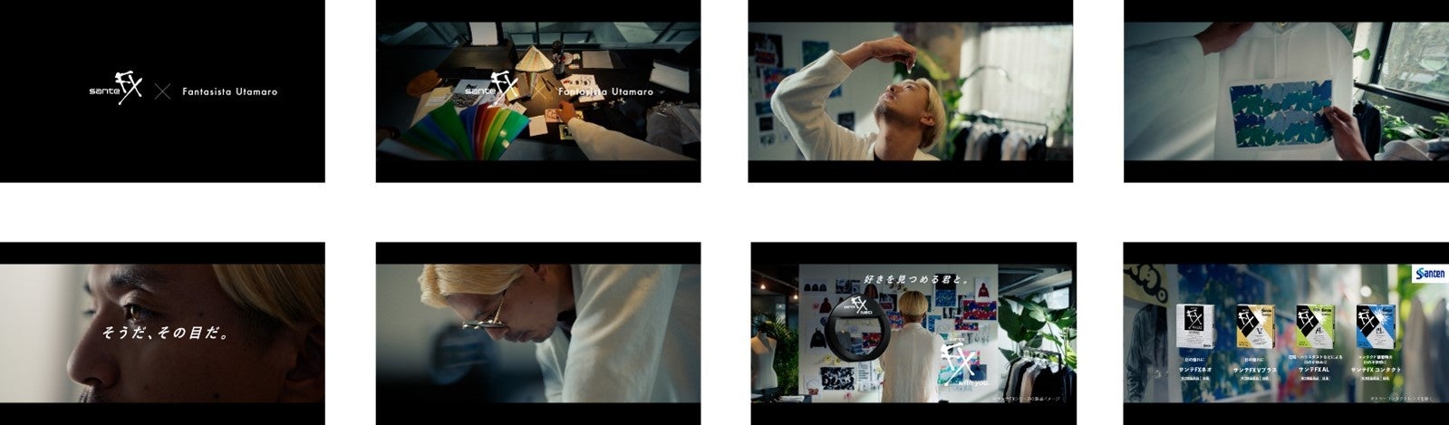 また、「サンテFX Artwork by Fantasista Utamaro」の発売に伴い、Fantasista Utamaro氏が出演するスペシャルムービー「そうだ、その目だ。」夢中篇 Fantasista Utamaro ver.をサンテFX公式サイトやSanten公式YouTubeにて公開中です。Fantasista Utamaro氏が、「サンテFX Artwork by Fantasista Utamaro」をはじめとするコラボレーションアイテムの創作活動の中、前向きな眼差しで創作へと向かうその姿に、ぜひご注目ください。