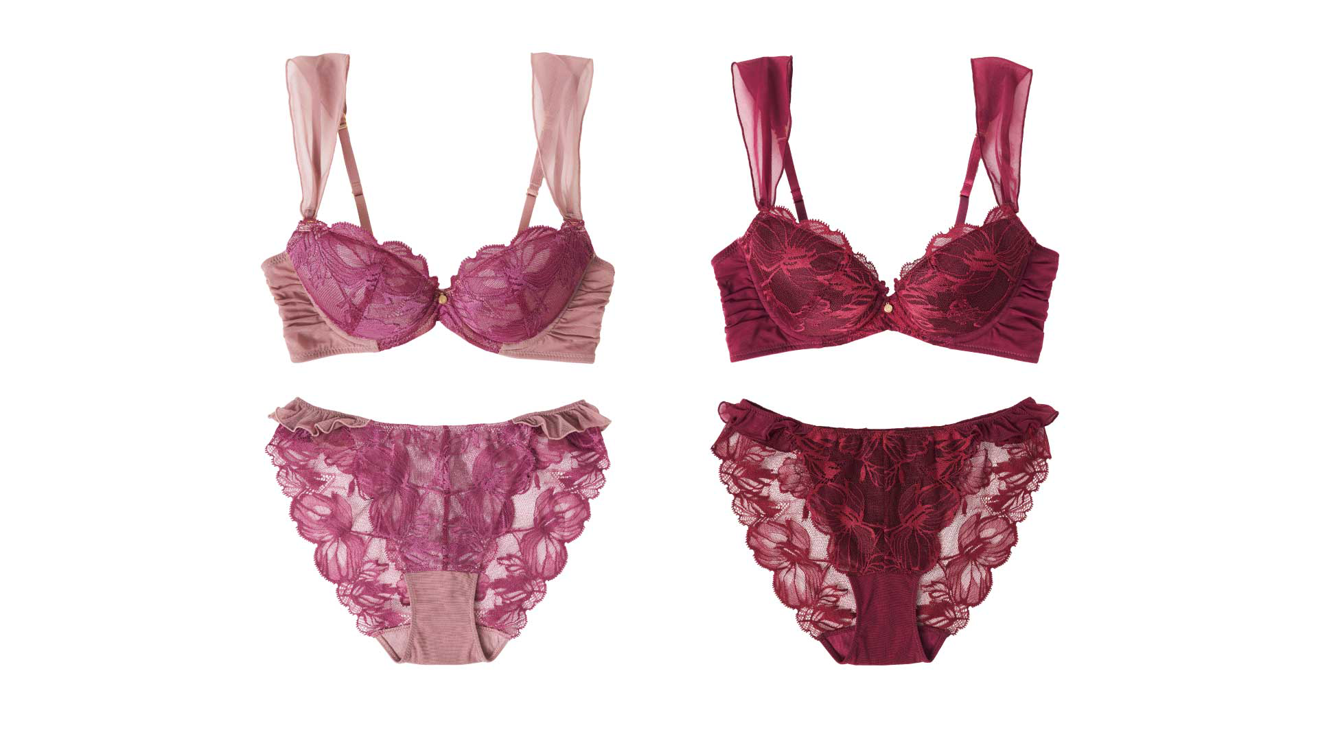 カラーはこの季節に纏いたいシックなred dahlia。そしてROSIERらしいマゼンタとモーヴの配色が絶妙なpink camelia。どちらのカラーもレース、チュール、ライニングそれぞれを染め分けて奥行きのある色味に。こだわりぬいたカラーはどちらも私に欠かせないです♡