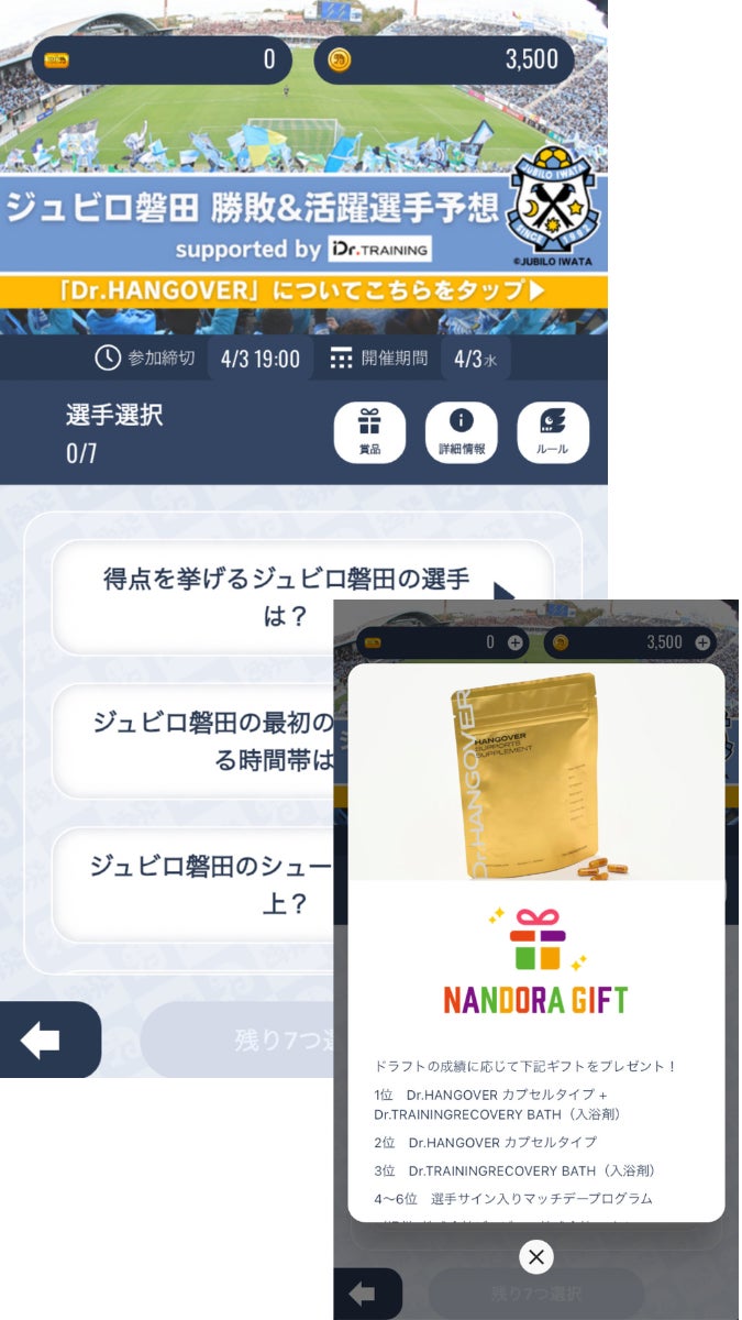 イノベーションの力で新たなスポーツ・エンターテインメントを創造し、まだ見ぬ感動と熱狂を提供するアプリ「なんドラ」を運営する株式会社なんでもドラフト(本社:東京都渋谷区、代表:森井啓允)は、4月3日(水)にヤマハスタジアムで行われる明治安田J1リーグ 第6節 ジュビロ磐田 対 アルビレックス新潟の試合を対象にした、クラブ公認の試合展開・活躍選手予想(協賛:株式会社Dr.トレーニング)を行います。