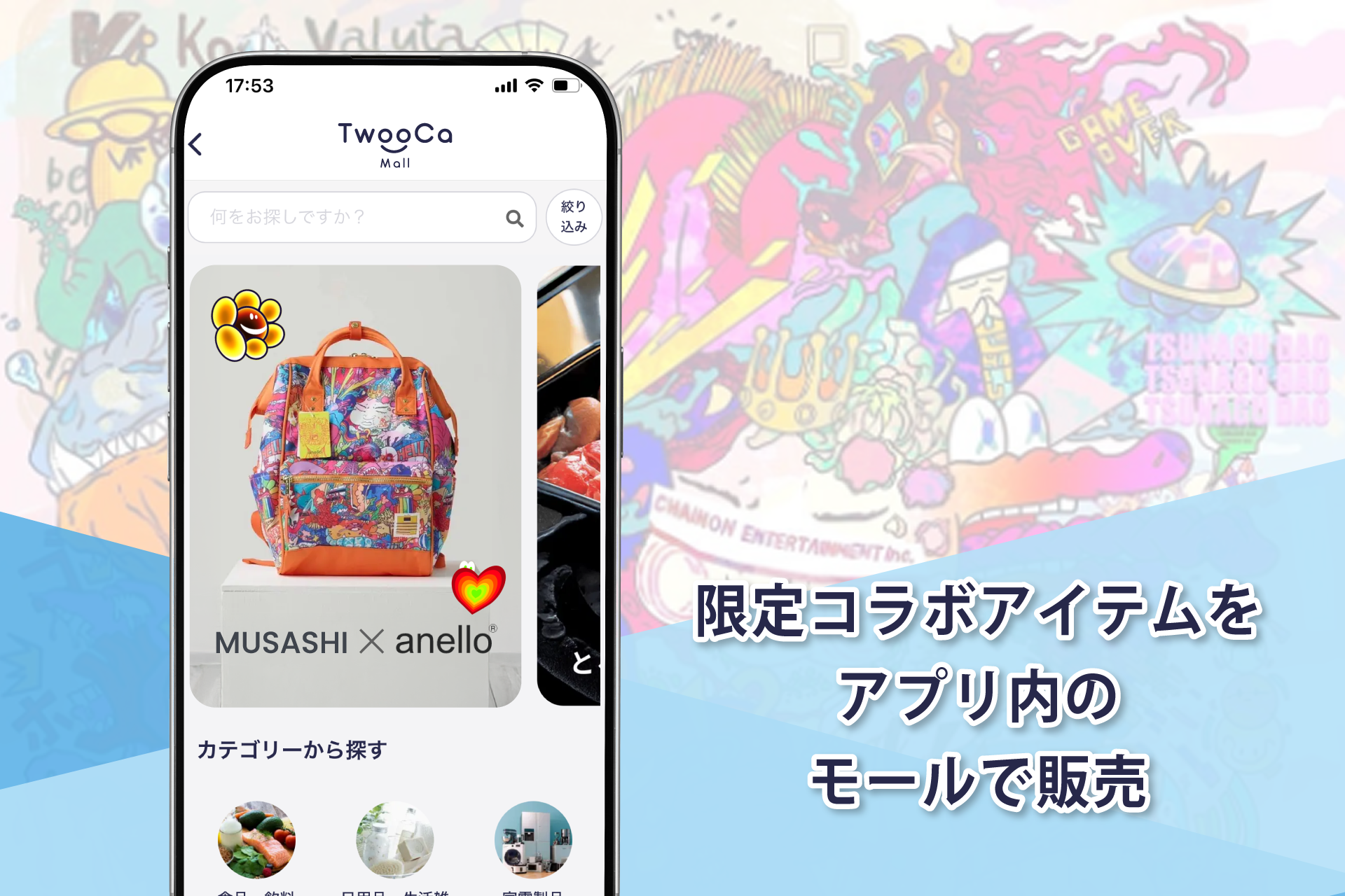 第一弾の取り組みとして、Next LifeはアーティストMUSASHI氏と、人気バッグブランド「anello®︎(アネロ)」によるコラボレーションリュックおよびポーチの限定アイテムを、アプリ内の会員限定のモールにて販売いたします。