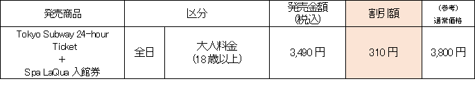 - ■Tokyo Subway 24-hour TicketとSpa LaQua(スパ ラクーア)入館券のセット券 概要