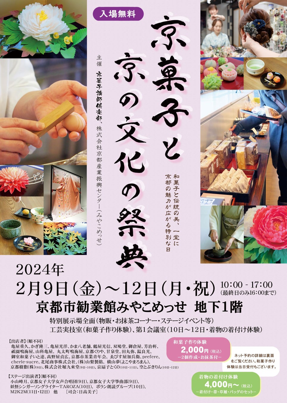 会期は2024年2月9日(金)~12日(月・休)の4日間、イベントは入場無料、和菓子作り体験はお抹茶付きで2,000円、着物の着付け体験(着物レンタル)は4,000円~です。ぜひ皆様のご来場をお待ちしております。