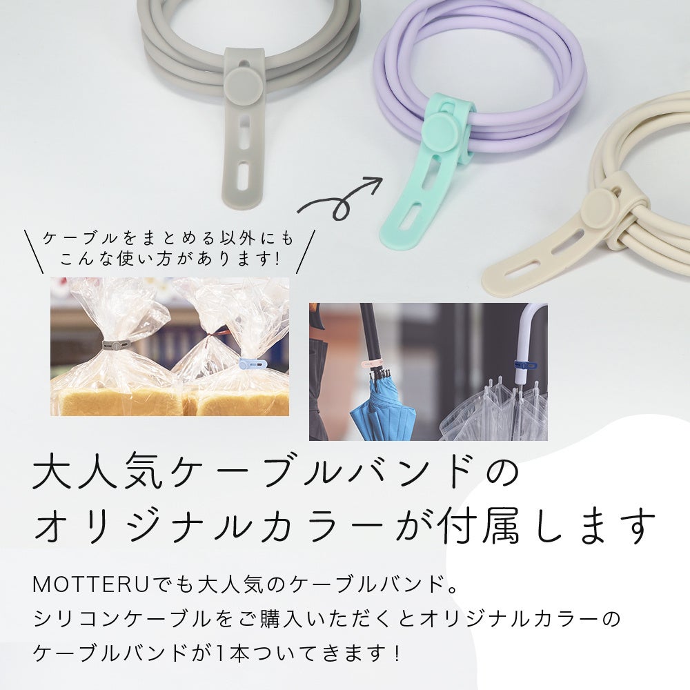 MOTTERUのシリコンケーブルは、多くのお客様に支持をいただいています。その特徴は、赤ちゃんの肌のようになめらかで、ずっと触っていたくなる手触りと、自分らしさを表現できるカラーバリエーション。今回はそんなシリコンケーブルに、しっとりと上品な新色のアーモンドミルクを追加しました。断線に強く、50,000回の屈曲試験をクリアした耐久性も備えています。またMOTTERUでヒット商品となったケーブルバンドが1本付属しています。やわらかいので、外出先でもまとめやすいケーブルです。