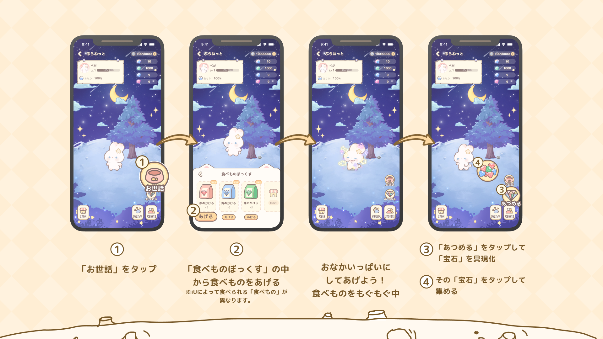 1)iUに食べものをあげておなかを満たすことで“宝石”を集めて、アプリ内で使えるアイテムへ交換できる。
