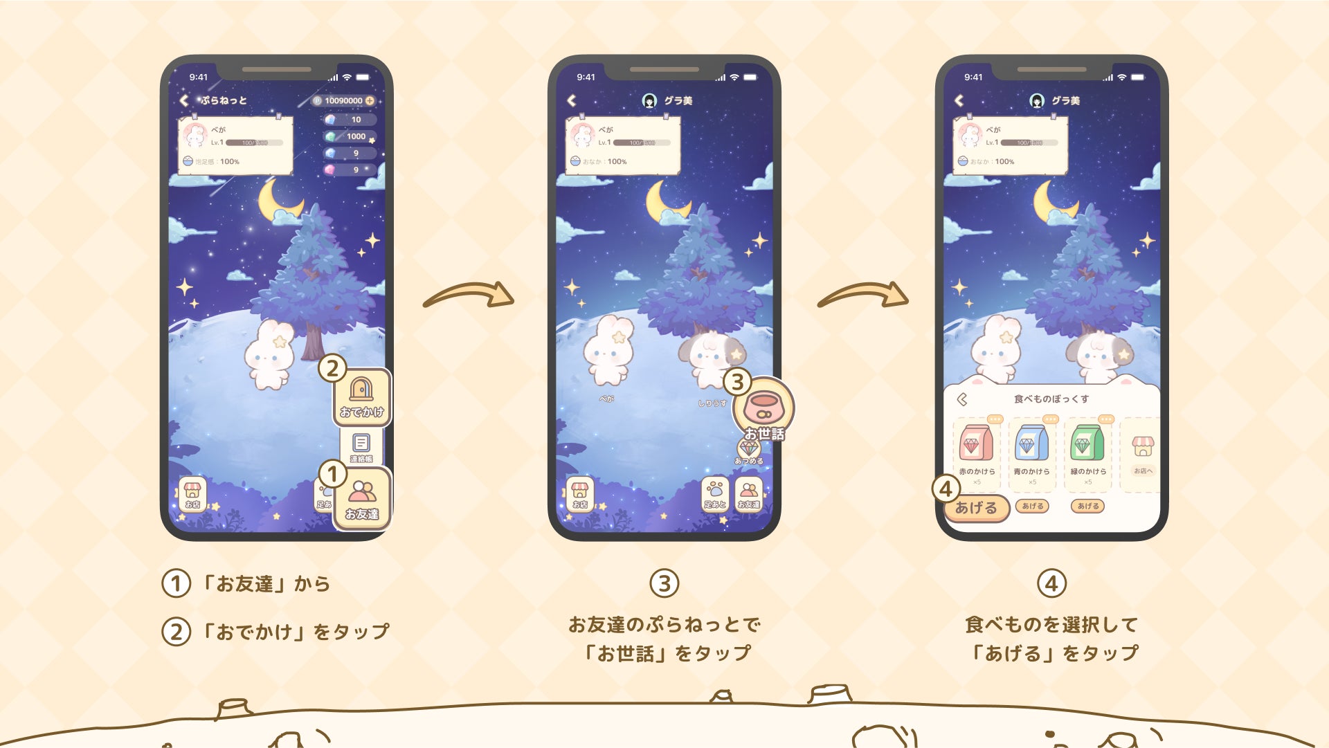 アプリ内で自分だけのiUを育成し、アプリ内で利用できるアイテムに交換したり、他ユーザーのiUと遊べる機能です。うさぎ、いぬ、ねこの中から自分好みのiUを1匹迎え入れ、一緒に遊んだり食べものをあげてお世話をしたり、他ユーザーのぷらねっとへおでかけをしたりすることができます。お世話をするとiUの体内で、アプリ内で使えるアイテムに交換ができる「宝石」が具現化(生成)され、獲得することができます。