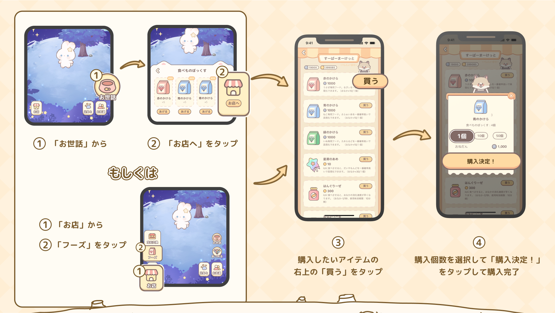 1、2)「お世話」から「お店へ」をタップ、もしくは「お店」から「フーズ」をタップし、「すーぱーまーけっと」ページへ移動。