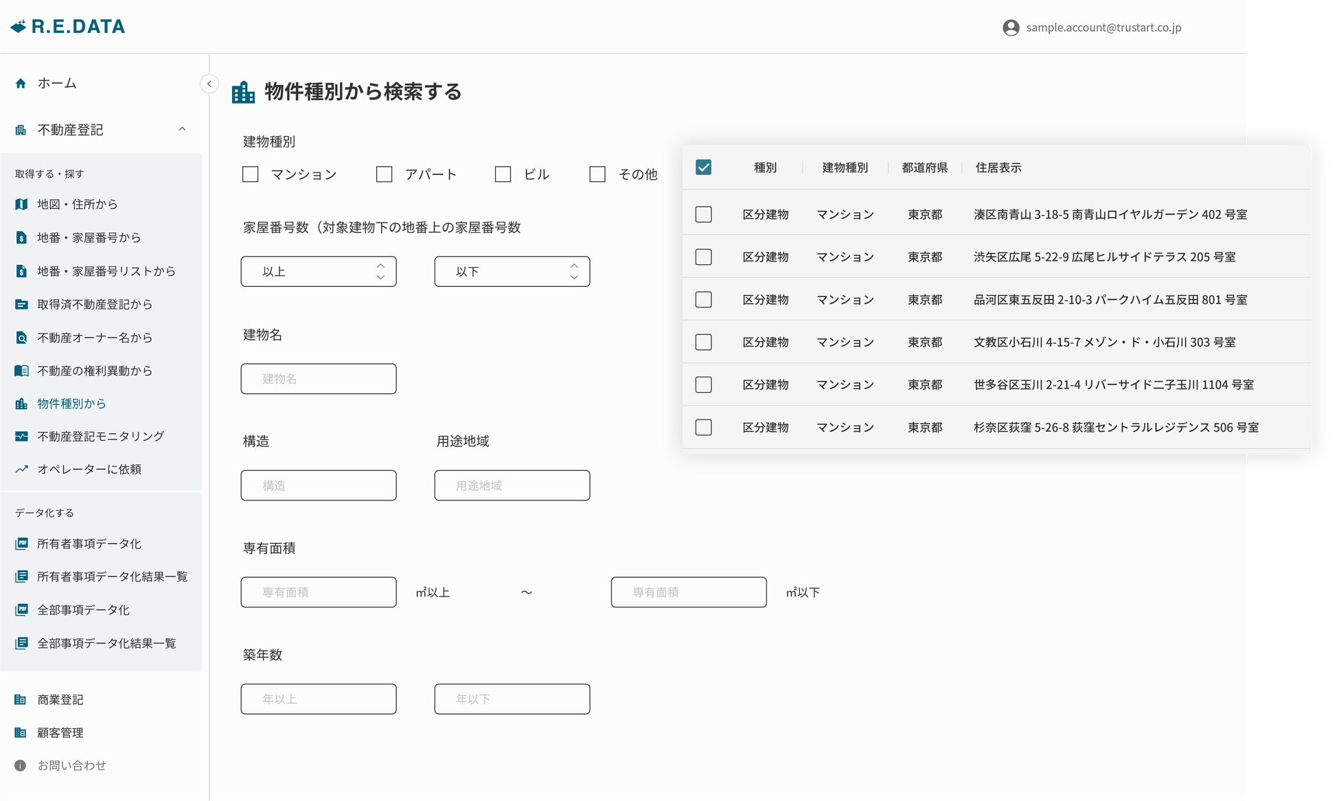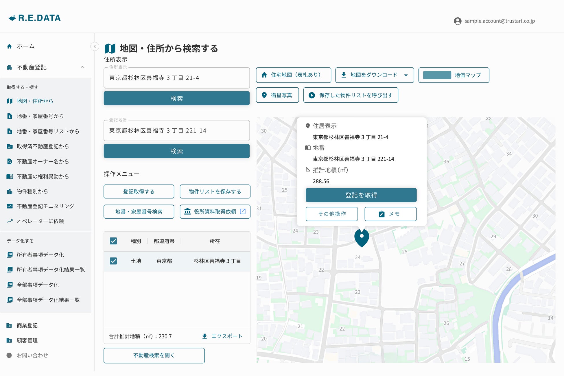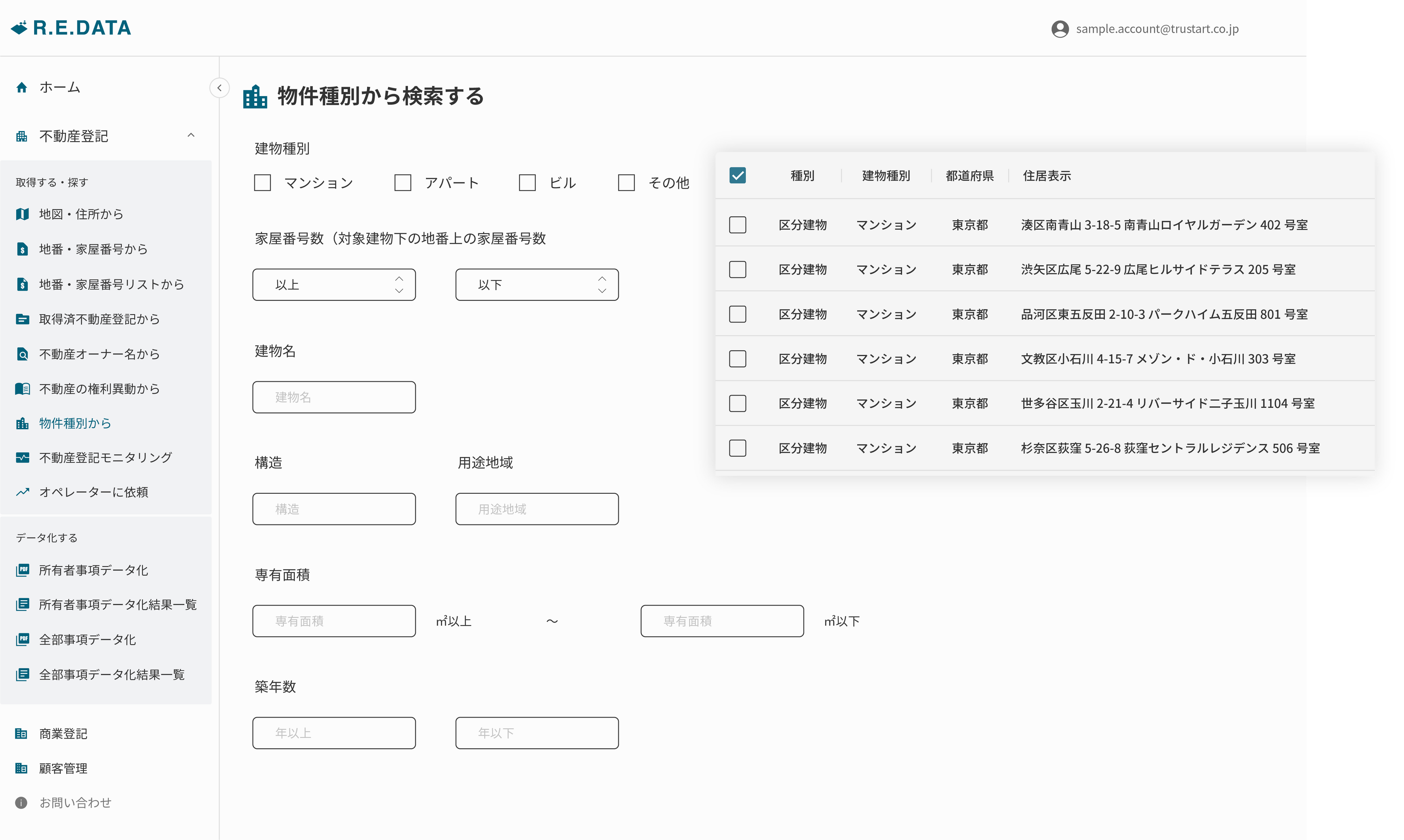 「R.E.DATA」は、インターネット上では入手できないアナログな不動産情報を独自に収集・データ化し、提供するプラットフォームです。登記情報・地番・公図をはじめとする不動産関連データなどを一元的に参照できる環境を提供し、営業活動の効率化、意思決定の精度向上に貢献しています。登記簿はもちろん、公図、地積測量図、建物図面などの不動産関連書類の取得も、システムからご依頼いただけます。