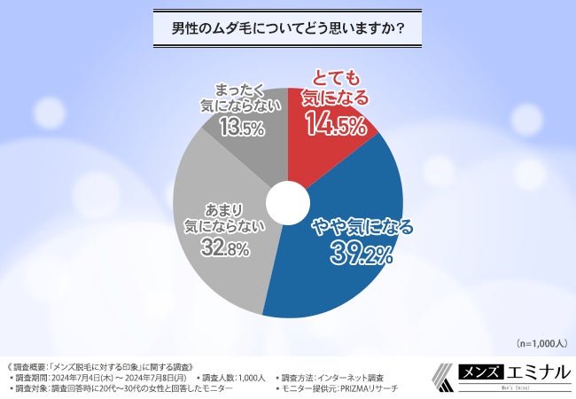 はじめに、「男性のムダ毛についてどう思いますか?」と質問したところ、『とても気になる(14.5%)』『やや気になる(39.2%)』『あまり気にならない(32.8%)』『まったく気にならない(13.5%)』という回答結果になりました。