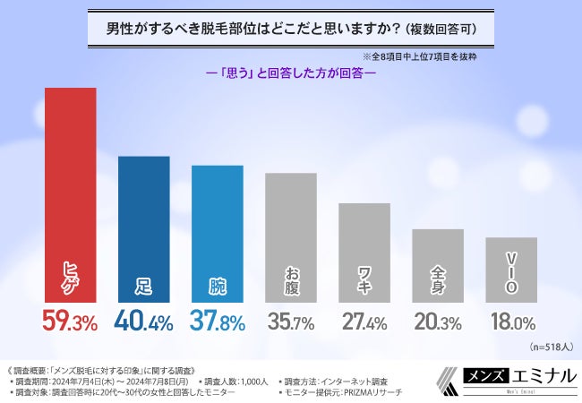 前述の質問で「思う」と回答した方に、「男性がするべき脱毛部位はどこだと思いますか?(複数回答可)」と質問したところ、『ヒゲ(59.3%)』と回答した方が最も多く、『足(40.4%)』『腕(37.8%)』と続きました。
