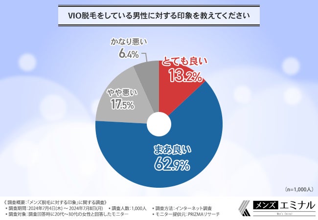 「VIO脱毛をしている男性に対する印象を教えてください」と質問したところ、『とても良い(13.2%)』『まあ良い(62.9%)』『やや悪い(17.5%)』『かなり悪い(6.4%)』という回答結果になりました。