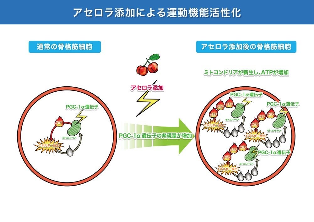 株式会社ニチレイフーズ(代表取締役社長:竹永雅彦)は、アセロラの運動能力機能への効果に関して、筑波大学との共同研究を実施※1し、第37回 日本動物細胞工学会2024年度大会 (JAACT2024)にて、その研究内容を発表しました。本研究の結果、骨格筋における効果を評価する実験用細胞(以下、「C2C12細胞」)において、アセロラが、PGC-1α遺伝子※2の発現量を大きく向上させ、ATP産生量とミトコンドリア※3量を増加させることが認められました。また、ヒト介入試験において、運動とアセロラ摂取を併用した場合に握力の向上が認められ、血中の抗酸化力を表す「BAPテスト」※4の数値が有意に向上しました。