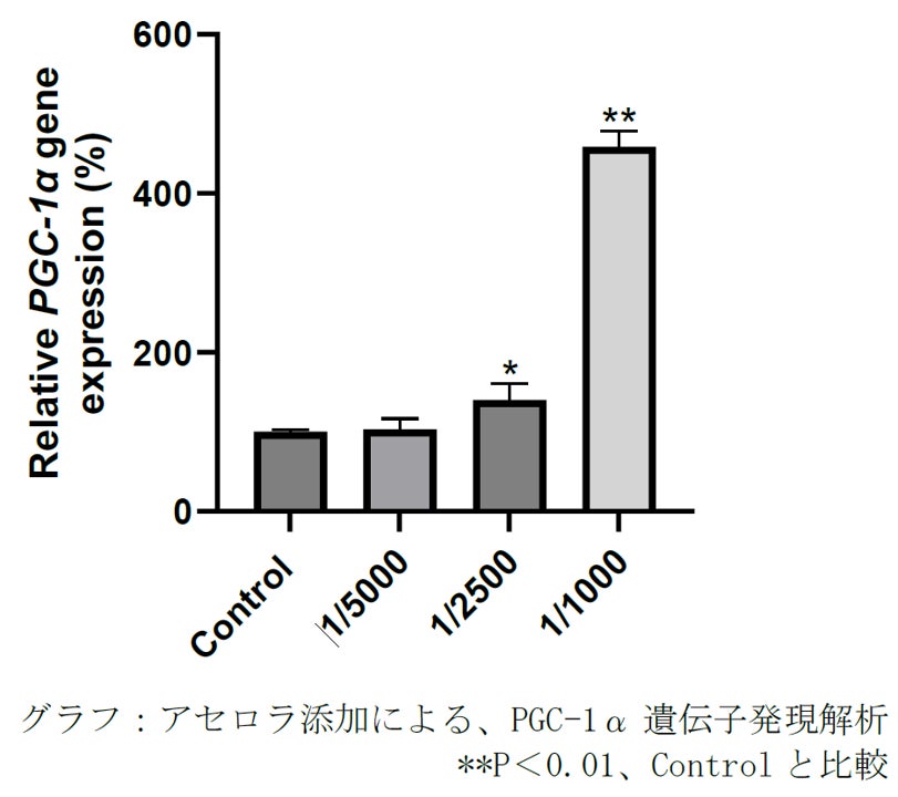 アセロラの添加により、C2C12細胞のATP産生量、ミトコンドリア量、PGC-1α遺伝子発現の増加が認められ、特に、PGC-1α遺伝子の発現は大きな増加が見られました※5。