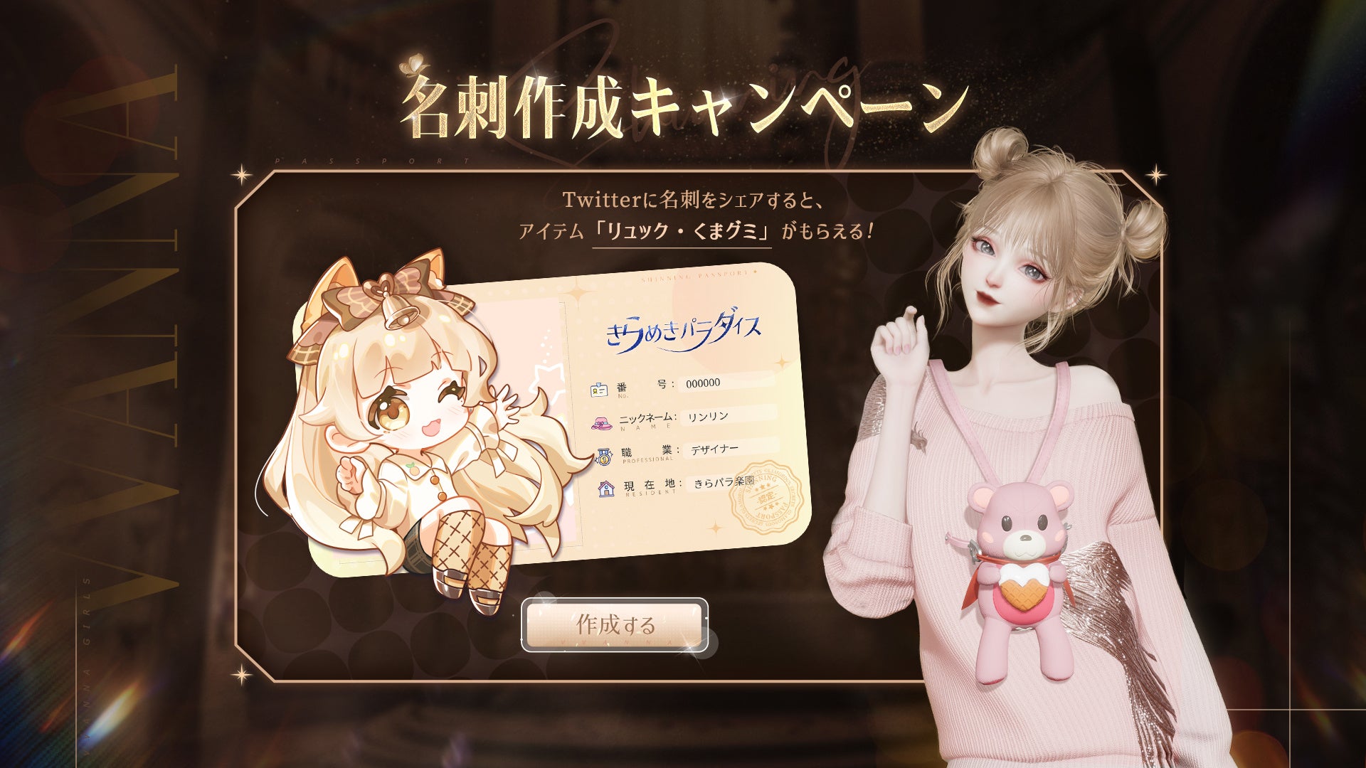『きらめきパラダイス』では、名刺を作成しTwitterにシェアするだけで、アイテム「リュック・ くまグミ」の交換コードがもらえるキャンペーンが開催中です。