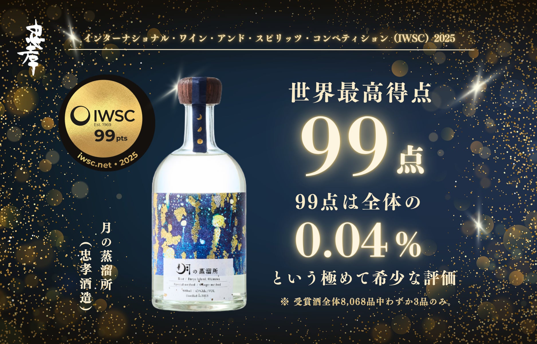 忠孝酒造の出品した酒2品が「IWSC 2025」で最高金賞をW受賞。さらに『月の蒸溜所』は99点という全受賞酒8,068品中わずか3品のみ(0.04%)という極めて稀少な快挙です。
