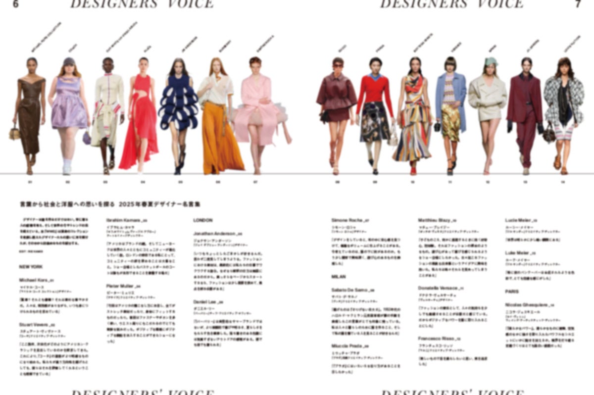 今回は、読み物も充実しています。冒頭では、「バレンシアガ(BALENCIAGA)」のデムナ(Demna)、「クロエ(CHLOE)」のシェミナ・カマリ(Chemena Kamali)、そして「ロエベ(LOEWE)」のジョナサン・アンダーソン(Jonathan Anderson)のインタビューを収録。25年春夏シーズンを語る上で欠かせない、「軽やかさ」や「開放感」、そしてファッションを未来に継承するための「シルエットの探求」などについて語ってもらいました。このほか、若手からベテランまで、28人のデザイナーの心の内も掲載しています。