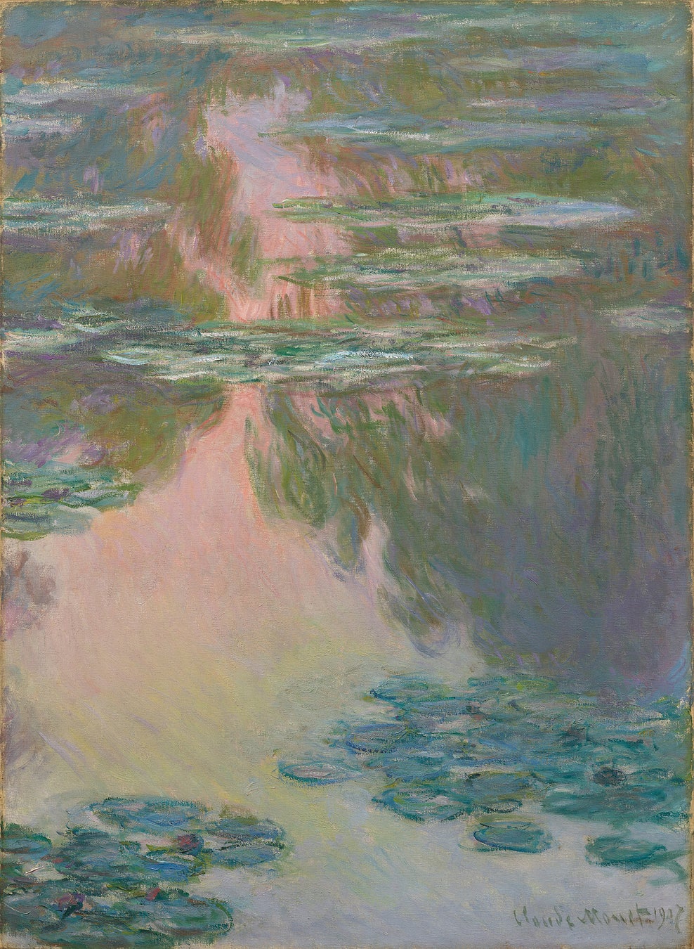 柳の枝がほんの少し描かれているほかは、睡蓮の花が浮かぶ水面が画面いっぱいに広がっています。水に映り込む光や空、木々の気配にそっと目を向けていることが感じられ、静かに流れる時間の移ろいを味わうことができる作品です。