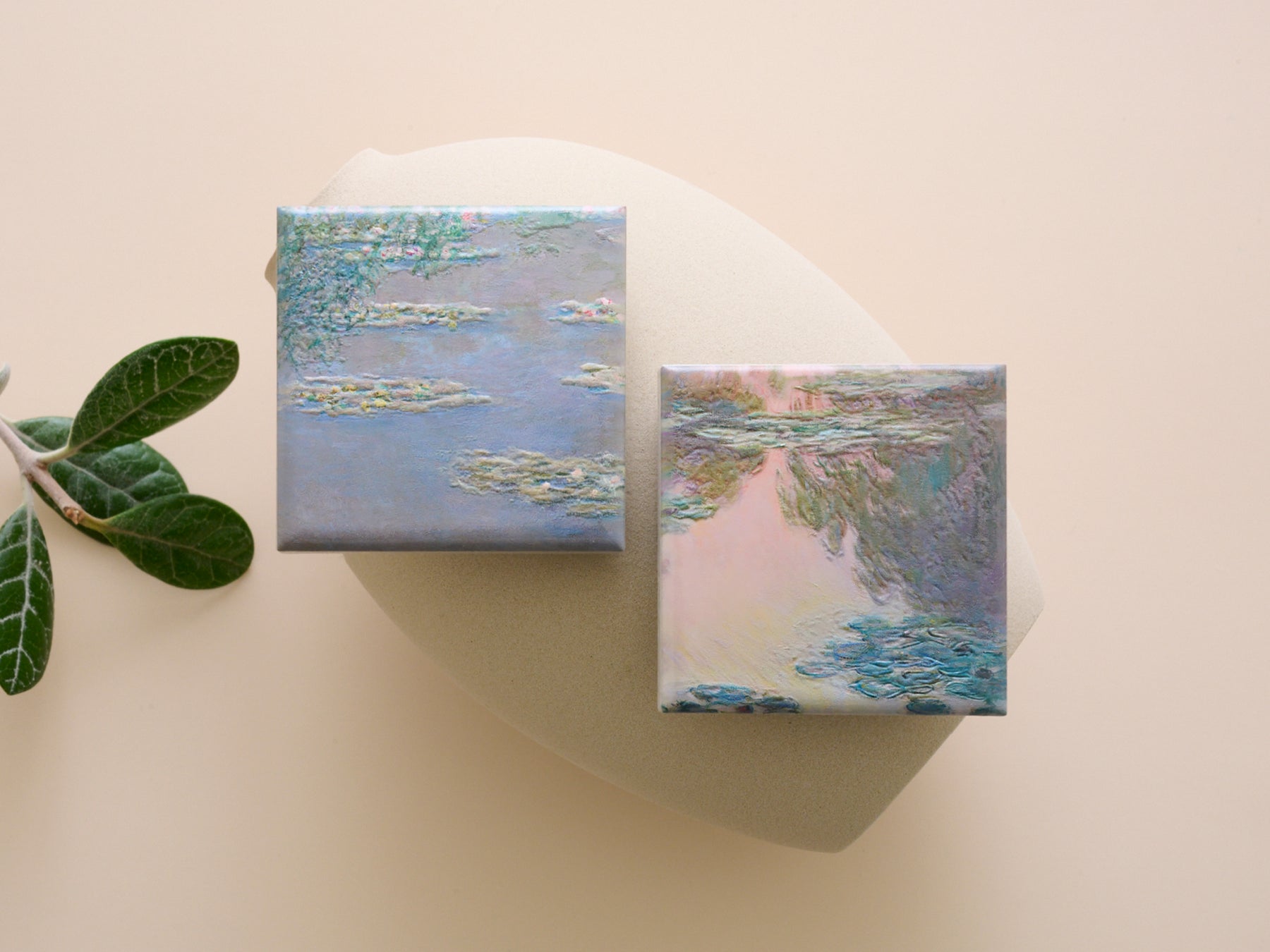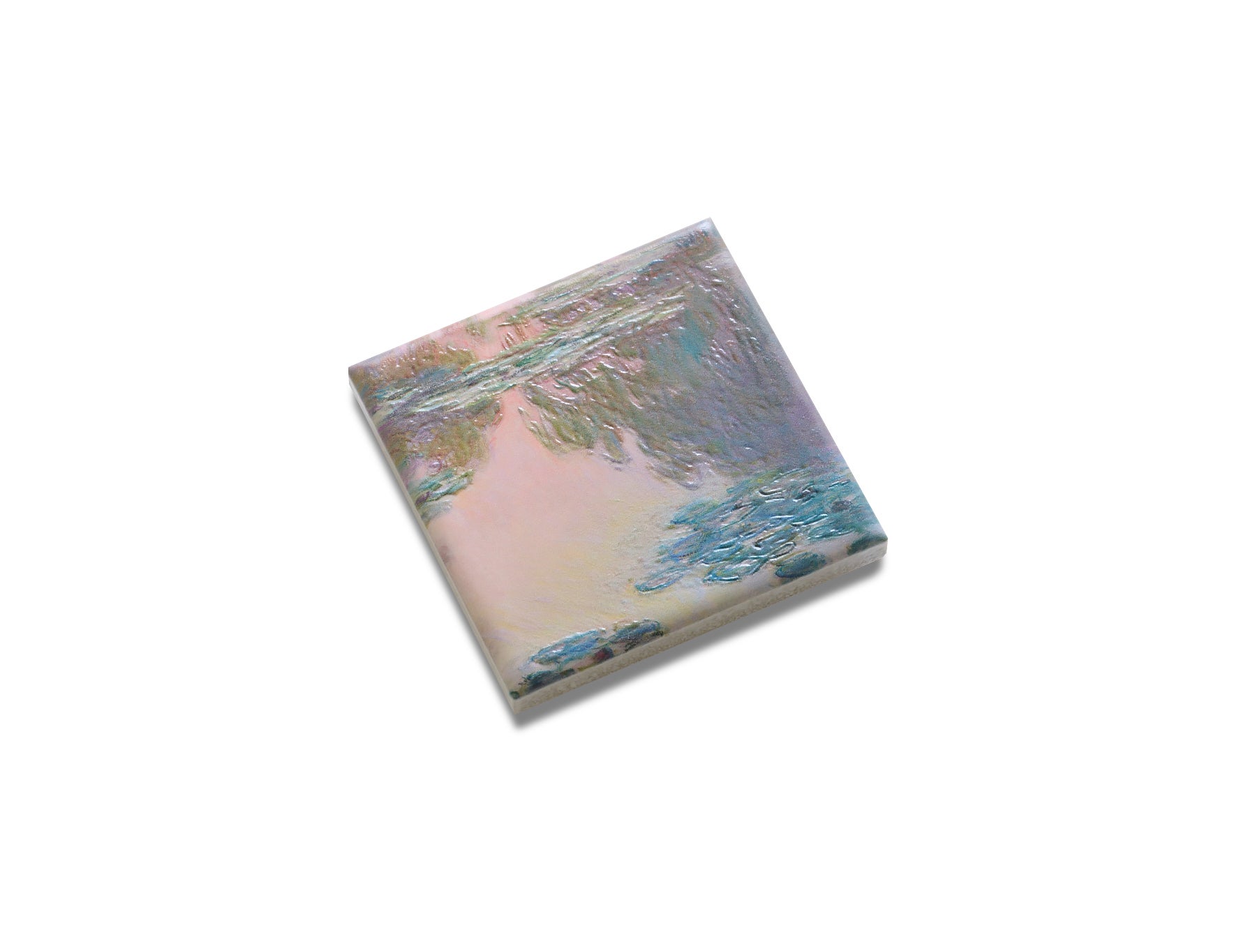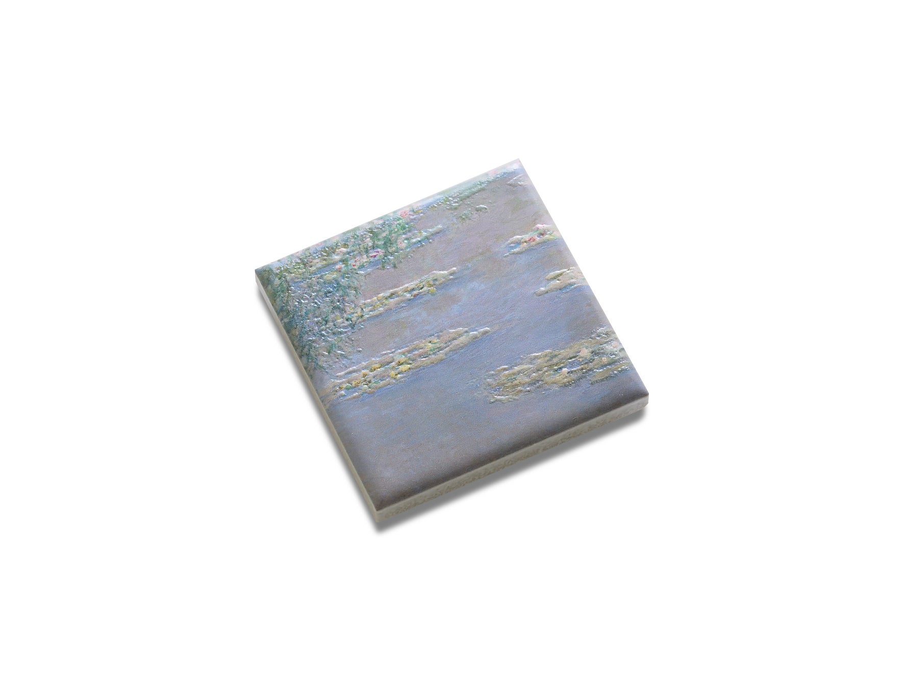モネ晩年の特徴である、赤みを帯びたやわらかな色合いを忠実に再現できるよう、色味の重なりやトーンの微妙な差にこだわりました。光の変化によって移ろう池の静かな佇まいが伝わるように仕上げています。また、水面に映り込む植物のかたちには、筆のタッチに寄り添うようになめらかな凹凸を加え、穏やかな水の流れや光の揺らめきを感じさせる、やさしい雰囲気をそのまま再現しました。モネが見つめ続けたジヴェルニーの水辺を、身近に感じることができるアイテムです。