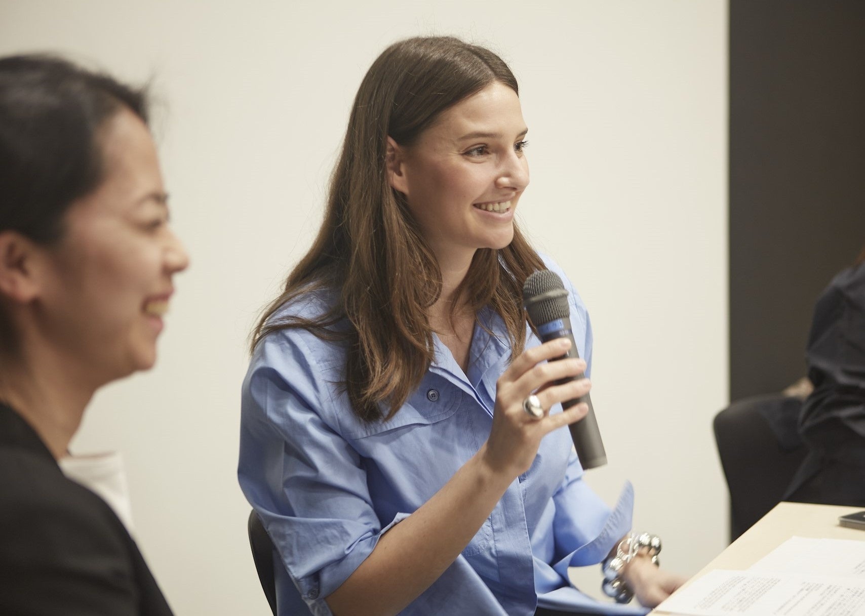 前半パートでは、パトゥのコラボレーションデザイナー兼ビジュアルマーチャンダイザーのMaya Rozier氏による講義が行われ、ブランドの理念や特徴、アトリエでの業務内容などが紹介されました。普段聞くことができないパリのハイブランドのアトリエの生の様子に、学生からの質問が絶えず、講義終了後も、一つ一つ丁寧に答えていただきました。