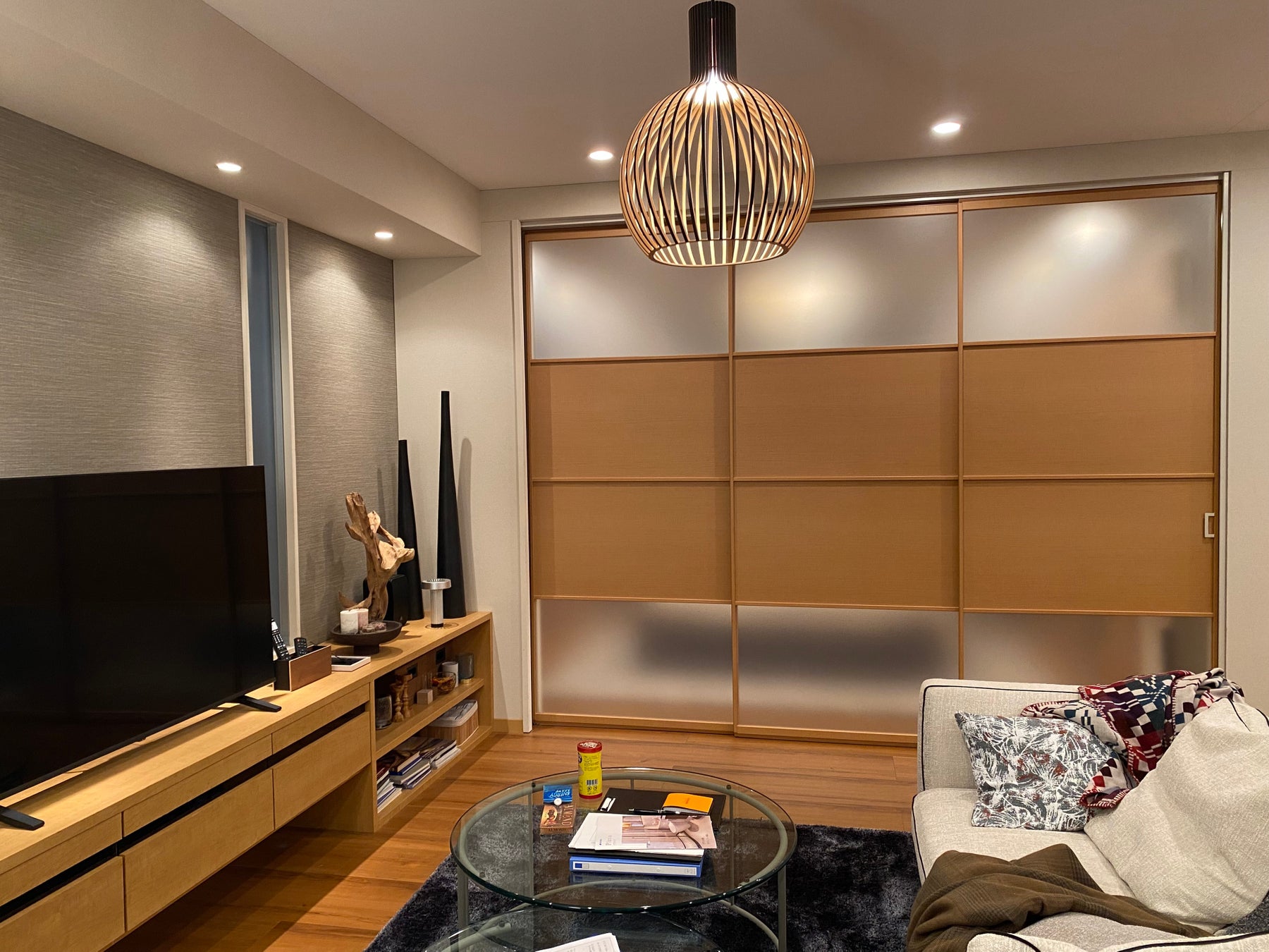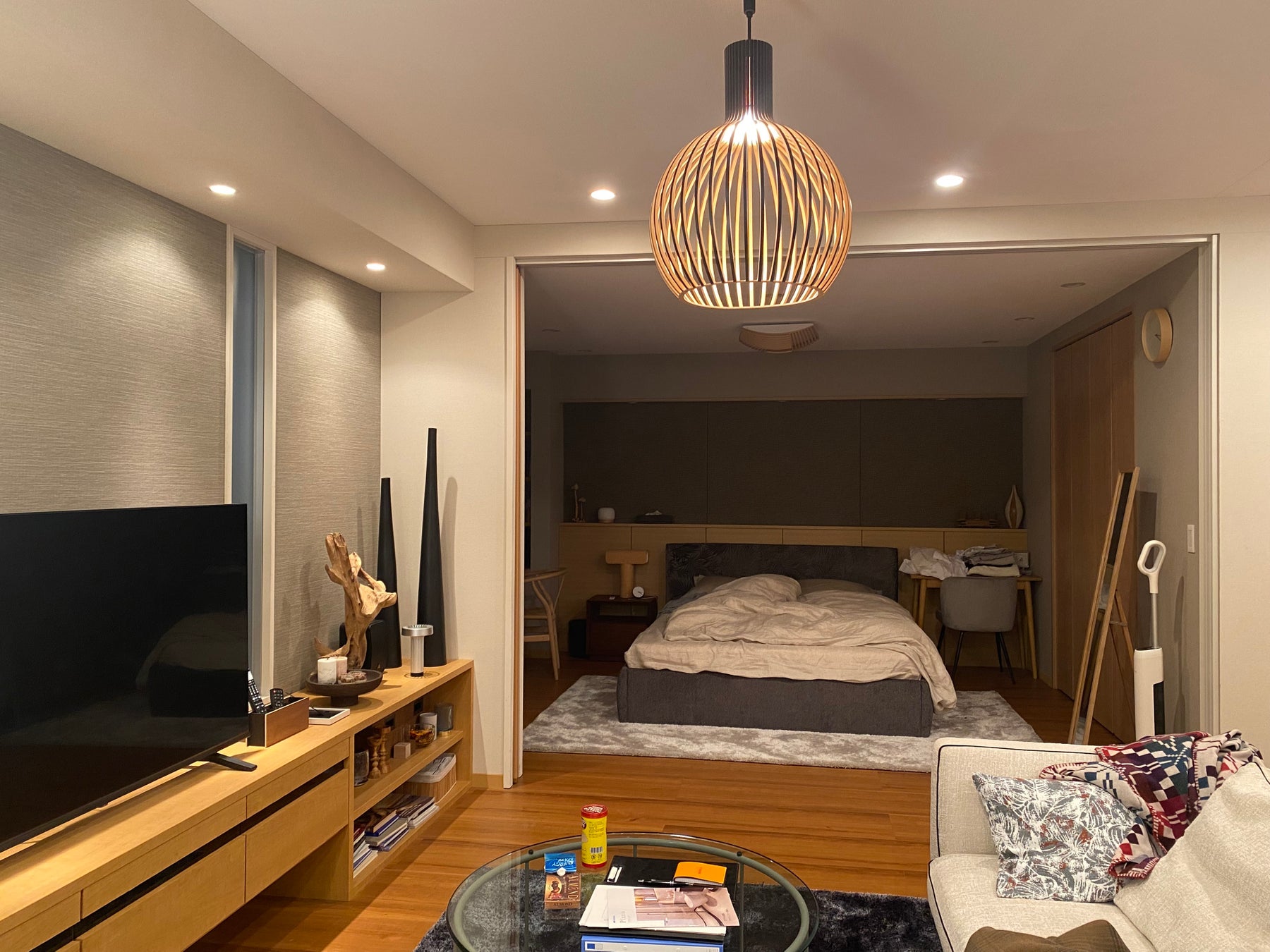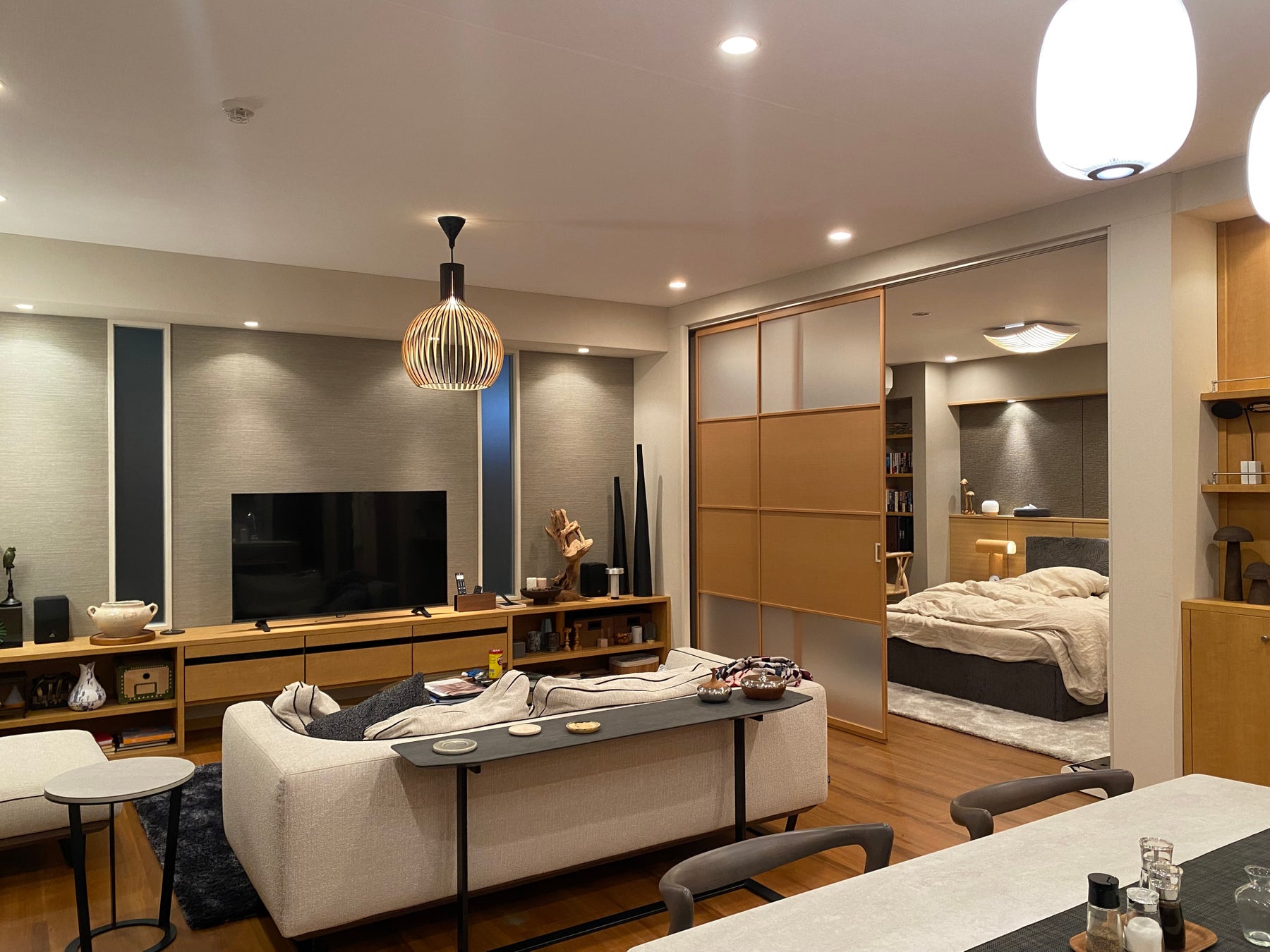 そんな2人の主人公が暮らすマンションに、木目調フレームが印象的な間仕切「プレイス スウィング」が使用されています。家具や床材と間仕切りを明るい木目調で統一することで、お部屋全体の一体感を実現しています。シンプルな引戸操作で、奥の寝室への出入りも容易です。また、床面にレールが不要なノンレール仕様のため、全開時に床にラインが入らず、空間に奥行き感が出てお部屋全体がより広く見えます。