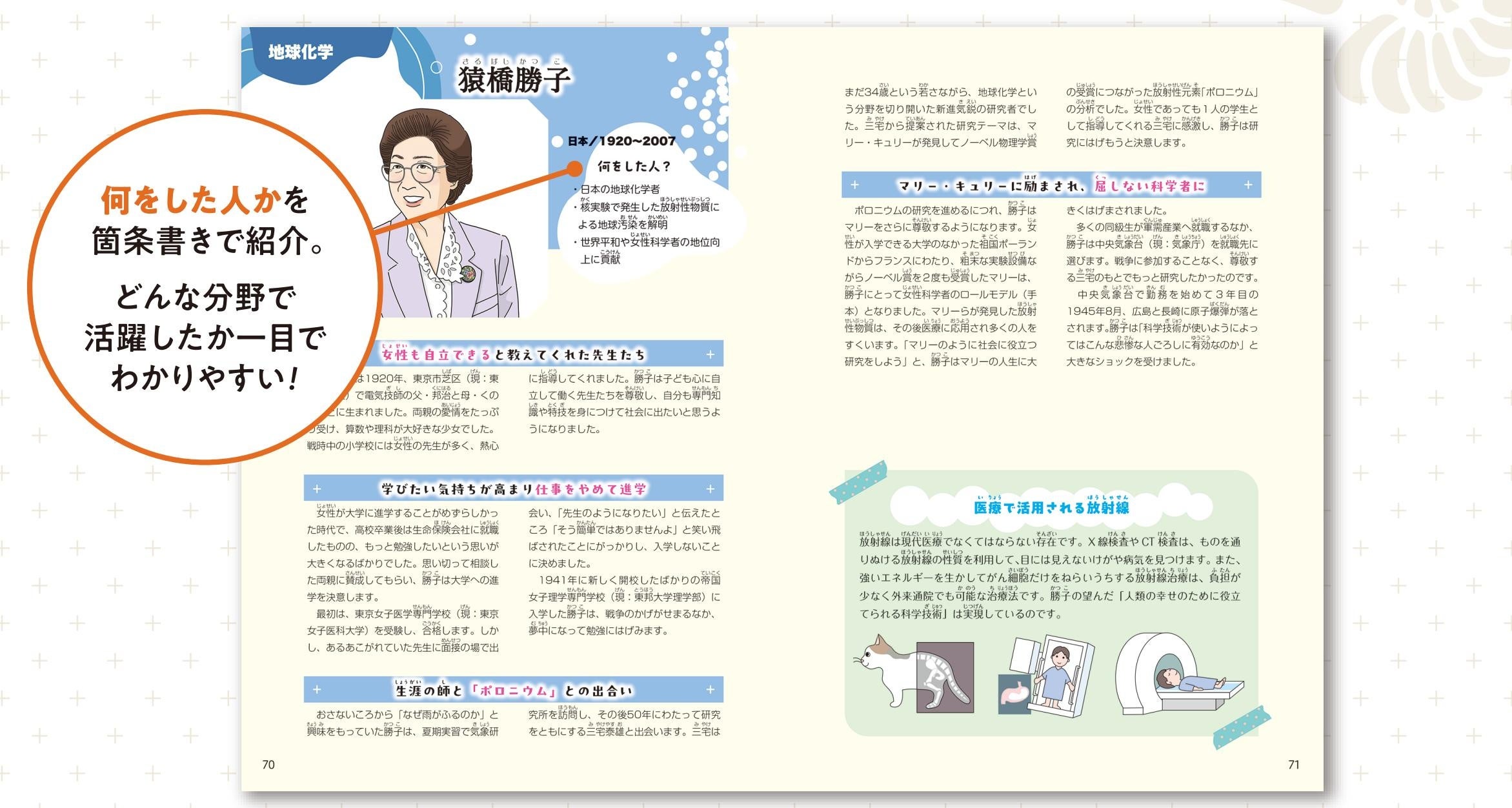また、世界で活躍した(する)女性科学者は、何も海外の人だけではありません。あまり知られていませんが、日本人の女性科学者たちも多く存在するのです。本書では彼女たちにもスポットライトを当て、紹介しています。