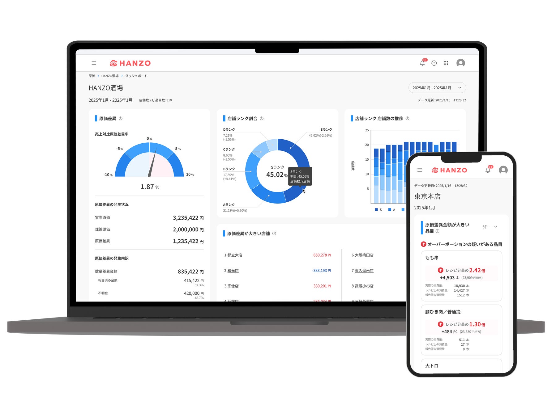 「HANZO 原価分析」は食材別の仕入れ・標準原価、棚卸、標準原価を設定したメニューレシピ、販売管理等のデータを自動連携・集計し、店舗・食材ごとに理論原価と実原価の差分を可視化します。差異と課題箇所を明らかにすることで、原価改善に向けた方針策定を可能にします。