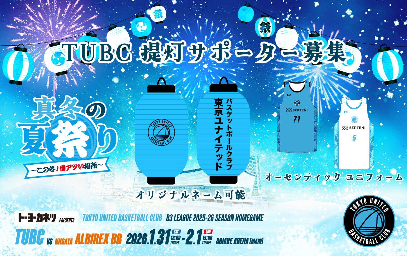 1/31(金)・2/1(土) 新潟アルビレックスBB戦のテーマは「真冬の夏祭り」。 この2日間、あなたの「推し選手」の名前やご自身のお名前を刻んだ提灯が、会場を熱く彩ります。