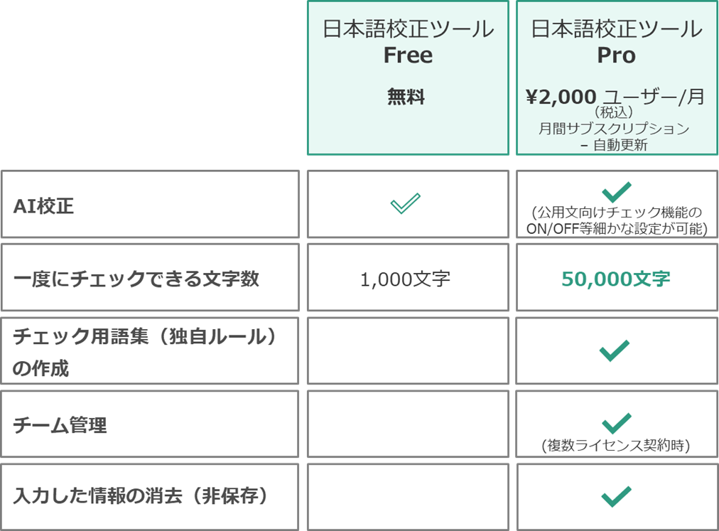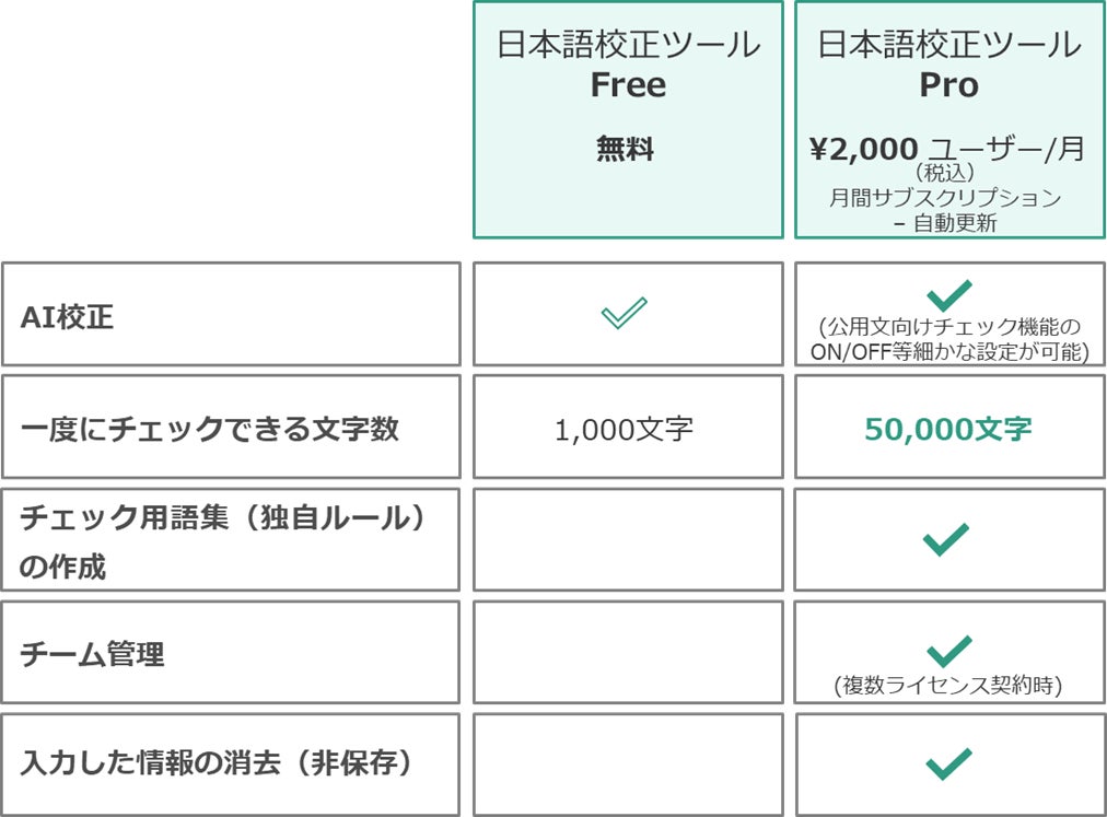 AIによる基本的な校正が可能な無償版と、チェック項目を細かく設定できる有償版(1ユーザー:月額2,000円(税込))にて、提供を開始します。法人の方も個人の方もご利用いただけます。