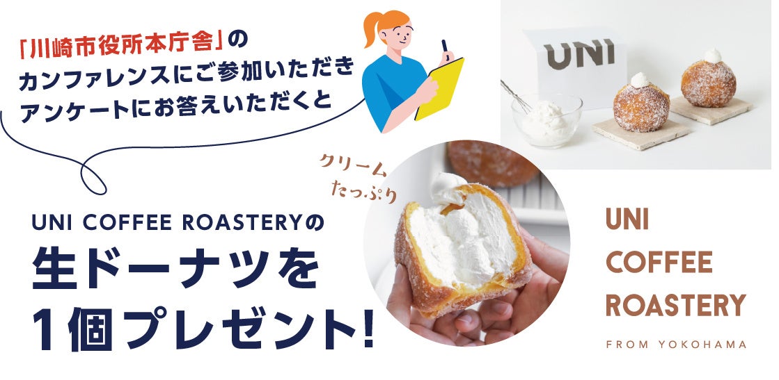 なお、「川崎市役所本庁舎」の2会場で開催されるカンファレンスへご参加+アンケートに回答いただいた方には、『UNI COFFEE ROASTERY 川崎市役所』の大人気メニュー・生ドーナツ(ホイップ)を1個プレゼント! ご参加を希望の方は、下記特設サイトより事前予約の上、ぜひお越しください。