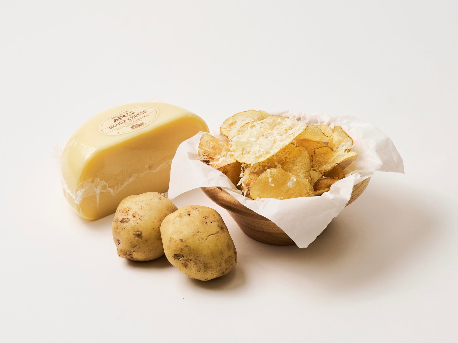 白く滑らかな肉質で、ホクホクとした食感と豊かな旨味が特徴の「伯爵いも」と、芳醇な香りとクセの少ないマイルドな味わいが特徴の「ゴ ーダチーズ」をザクっと軽やかなチップスに仕上げました。
