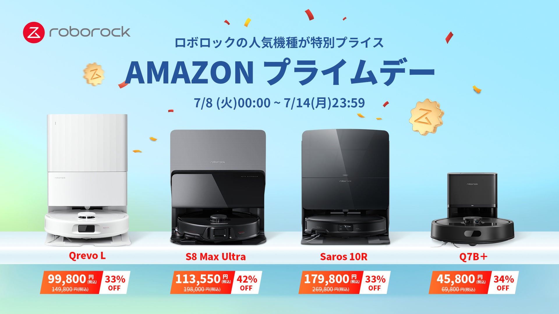 今回のAmazonプライムデーでは、Roborockの人気製品である四隅に伸びるサイドブラシと壁キワ用モップを搭載し、進化を遂げて驚異の清掃力を実現した「S8 Max Ultra」を約42%オフの113,550円(税込)の特別プライスでご用意しております。また、今年6月中旬新発売の先進ナビゲーションで驚くほど薄く、パワフルなフラッグシップモデルの超薄型ロボット掃除機「Saros 10R」を約33%オフの179,800円(税込)、性能と機能を充実させ、コンパクトな全自動ドックを搭載したロボット掃除機「Qrevo L」を約33%オフの99,800円(税込)、Roborock史上最もコンパクトなボディサイズながら、パワフルな吸引力を誇る「Q7B+」を約34%オフの45,800円(税込)にて販売いたします。Roborockは快適でスマートな掃除を実現するロボット掃除機で、皆様の生活をサポートします。