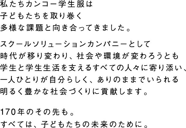 カンコー学生服は、今後も、一人ひとりが自分らしく、ありのままでいられる、明るく豊かな社会づくりに貢献し、スクールソリューションカンパニーとして、子どもたちがドキドキ、ワクワクするような未来創りを目指します。