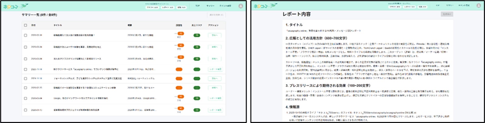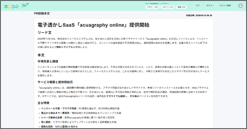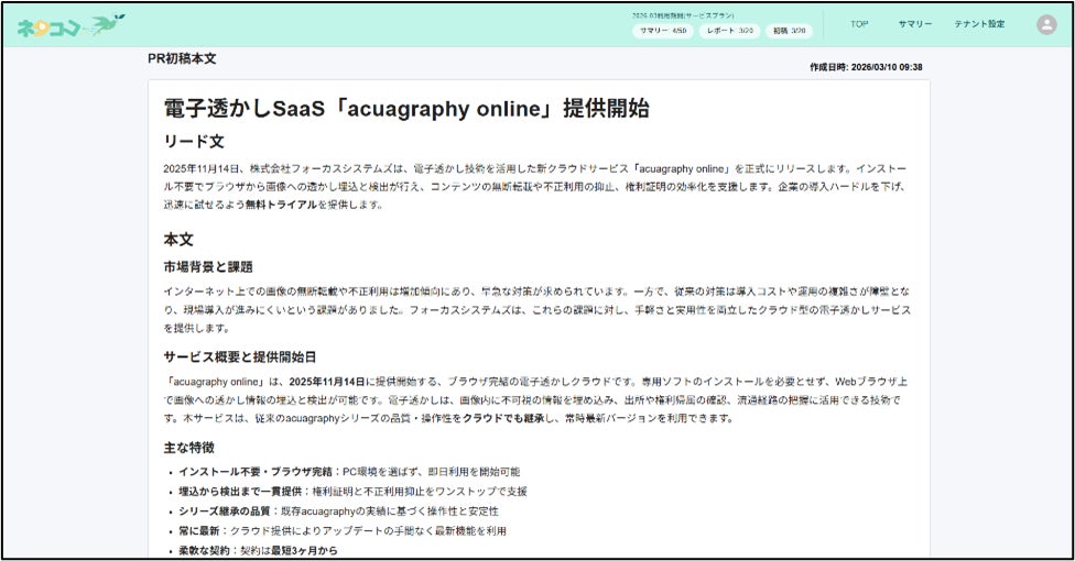 株式会社フォーカスシステムズ(本社:東京都品川区、代表取締役社長:森啓一、以下「当社」)は、広報担当者が抱える「ネタ枯れ」と「リソース不足」とを解決する広報部門向け提案型AIサービス“ネタココ”を2026年3月26日より提供開始いたします。