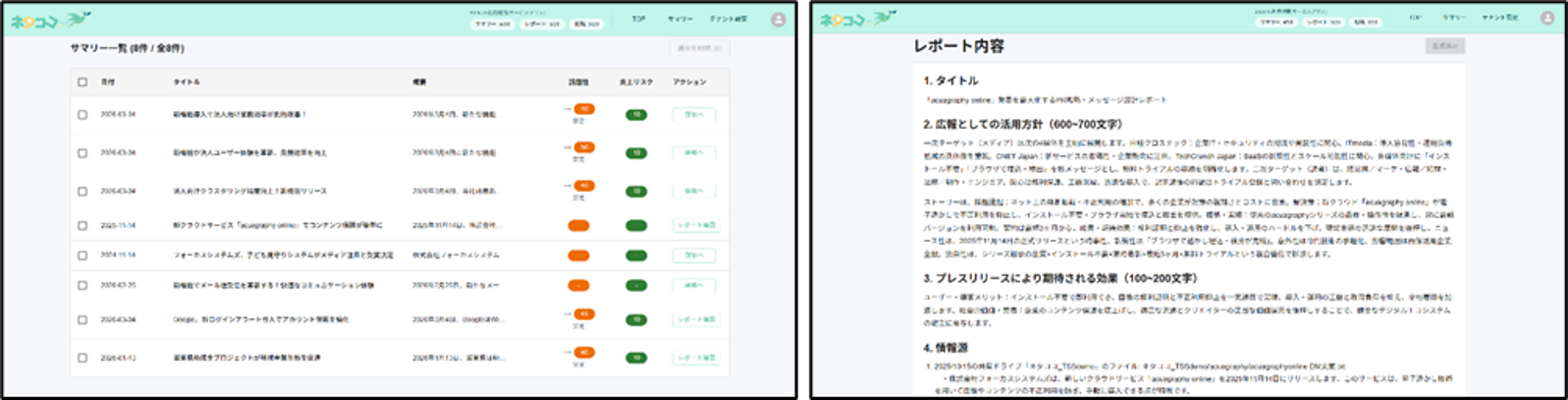 発掘されたネタに対し、AIがニュースリリースの構成案(レポート)を提示し、ワンクリックで初稿を生成します。