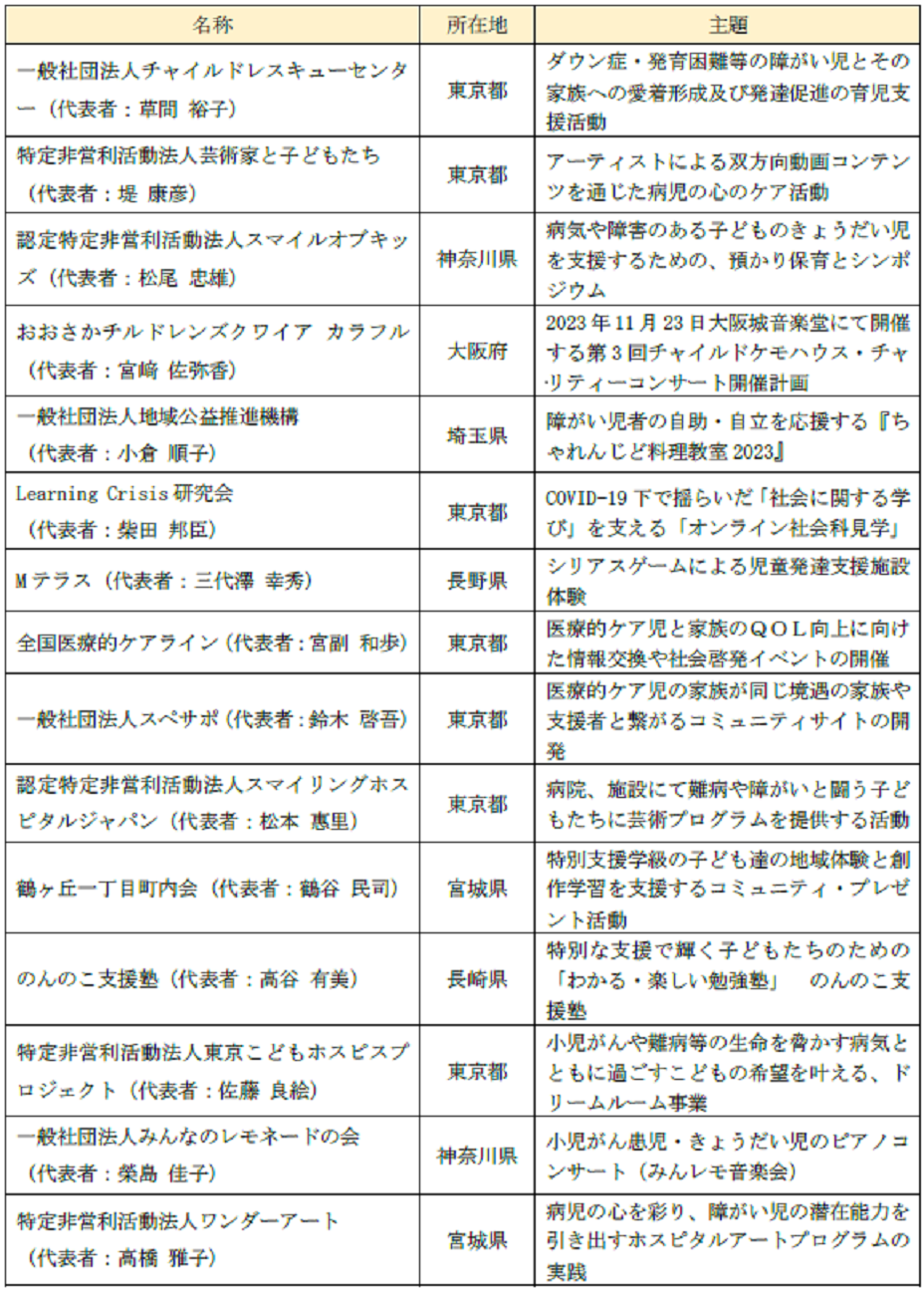 本財団は、障がいや病気に悩む子どもたちとそのご家族にとっての「“あったらいいな”をカタチにする」ことを目的に、そうした方々の支援に取り組む団体や関連事項の調査研究に取り組む方々を支援しています。