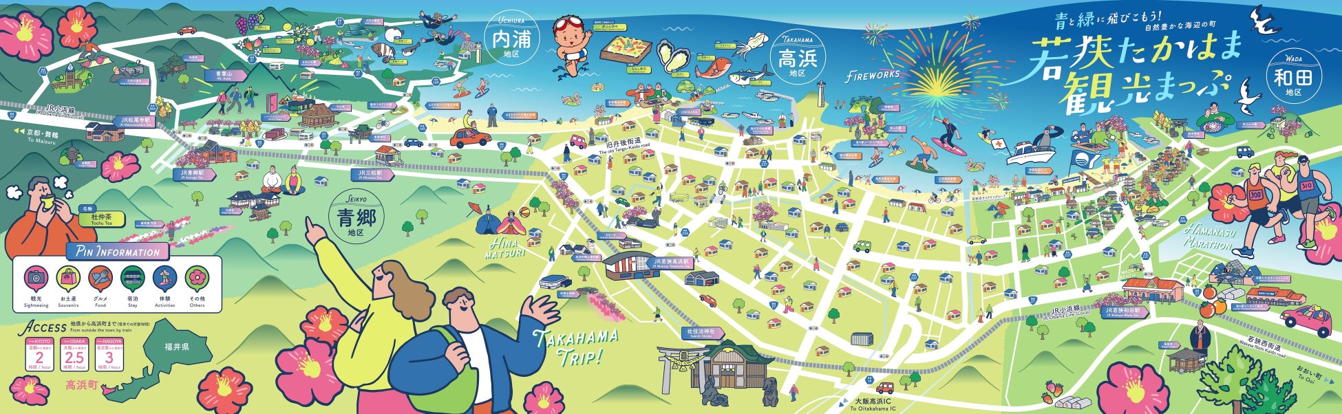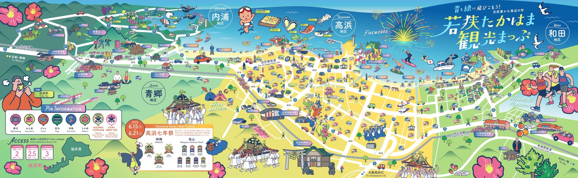 本マップは、数えで7年に一度開催される福井県高浜町の伝統行事「高浜七年祭(たかはましちねんまつり)」の開催に合わせて作られたイラストデジタルマップで、青と緑に彩られた自然豊かな海辺の町・高浜町の魅力を余すところなく詰め込んだマップとなっています。
