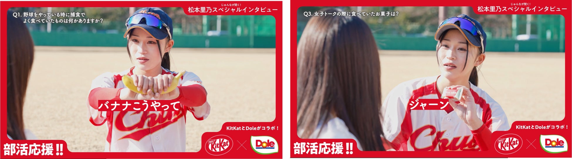 さらに今回のコラボを盛り上げるのは、「野球ガール」として人気のインフルエンサー、「まつりの」こと松本里乃さんとのタイアップでお送りする「部活を頑張っている学生に向けた、応援メッセージ」。動画内では、松本さんの高校時代、選手生活をサポートした「キットカット」とバナナの思い出トークや、簡単で美味しいチョコ&バナナレシピの紹介のほか、「Doleバナナ」と「キットカット」の、意外な共通点も明らかに…?!動画はTikTok・InstagramをはじめとしたSNSほか、店頭デジタルサイネージでも配信予定です。ぜひご覧ください。
