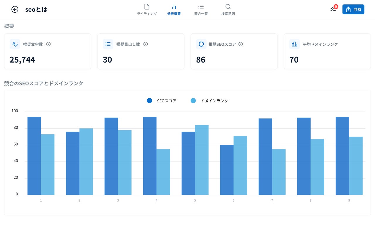 平均SEOスコア:上位記事の平均的なSEO評価を可視化し、自分の記事の検索エンジン最適化の目安として役立てられます。独自アルゴリズムにより、コンテンツの品質や被リンク状況など、複数の指標を総合的にスコア化しています。