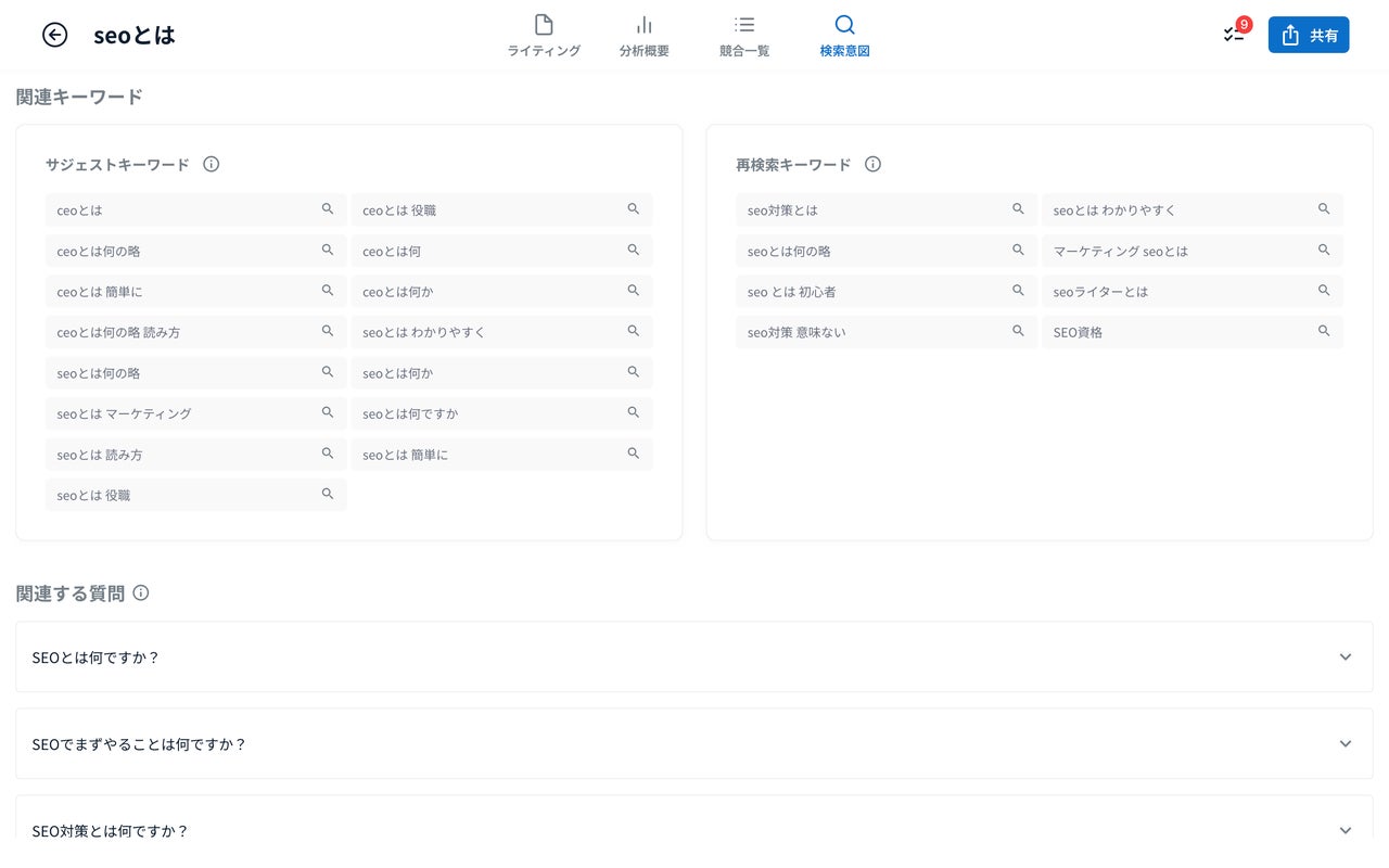 推奨文字数:狙うキーワードで上位にある記事や業界標準から導き出される最適な文字数を自動的に算出します。たとえば、「2000〜2500文字程度が理想」など、あくまで目安として提示するため、ライターの方がさらに記事を充実させる際の指針となります。