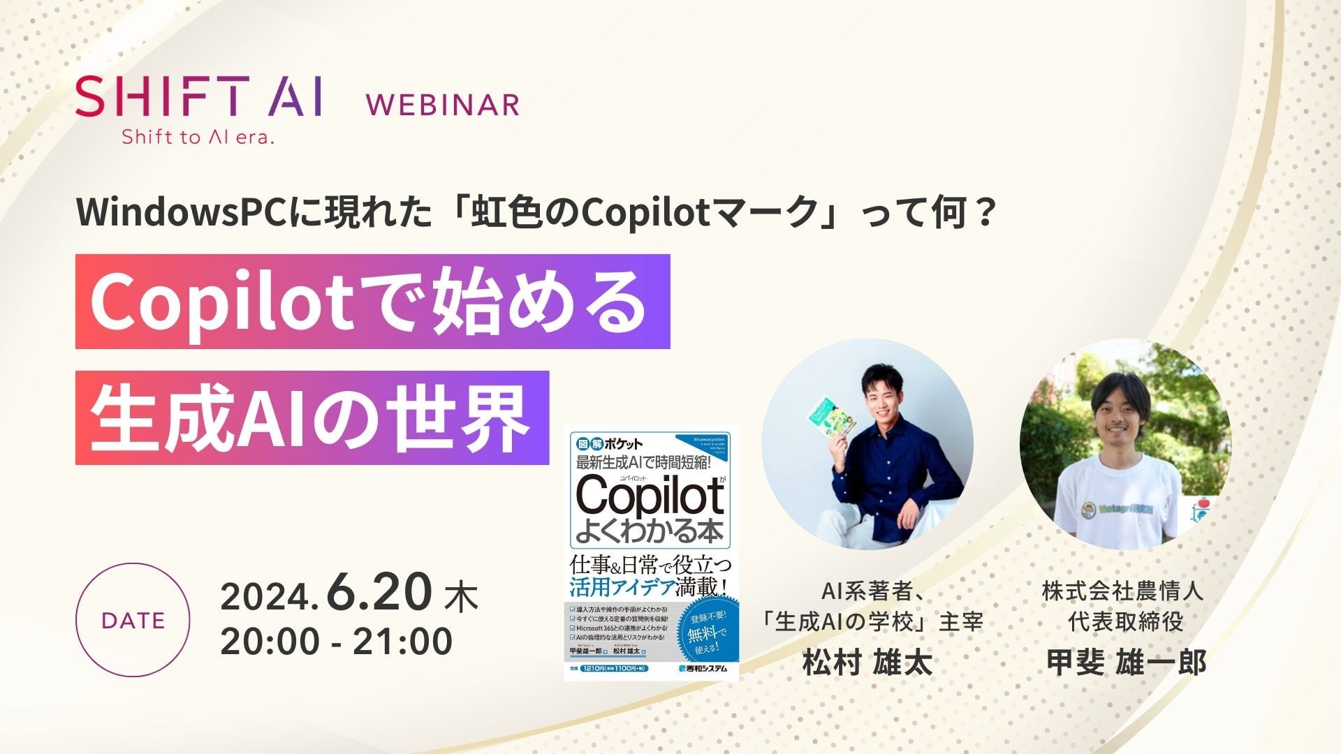 2024年6月18日に株式会社秀和システムより発売される『図解ポケット 最新生成AIで時間短縮! Copilotがよくわかる本』の出版を記念し、著者の甲斐雄一郎氏と監修者の松村雄太氏が、国内最大級のAI活用コミュニティ「SHIFT AI」が主催の初心者向けオンラインセミナーに登壇します。このセミナーでは、Copilotの基礎知識から実践的な活用法まで、初心者向けにわかりやすく解説します。