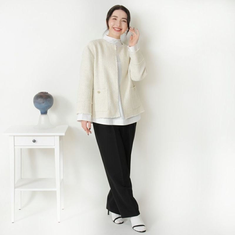 上品になりすぎず、普段使いもできるツイードジャケット。フォーマルシーンにはもちろん、デニムなどのカジュアルなボトムと合わせても◎