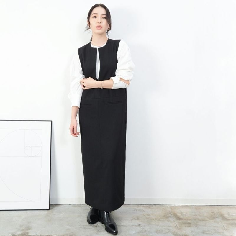 上品なイメージのロングワンピースドレスです。インナー次第でON・OFFどちらにも使えるアイテムです。