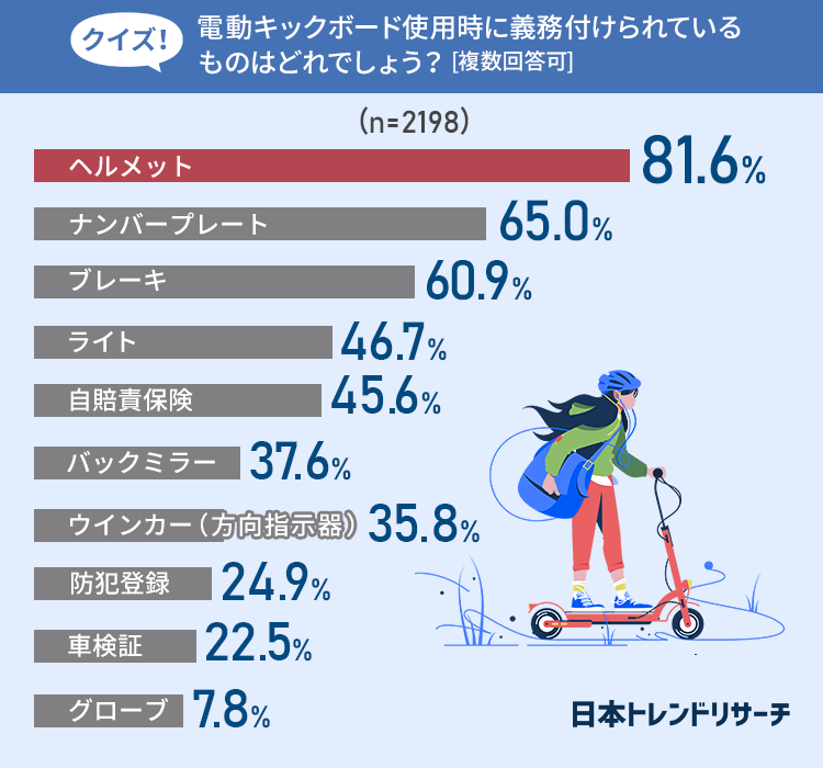質問4:クイズ! 電動キックボード使用時に義務付けられているものはどれでしょう?[複数回答可]