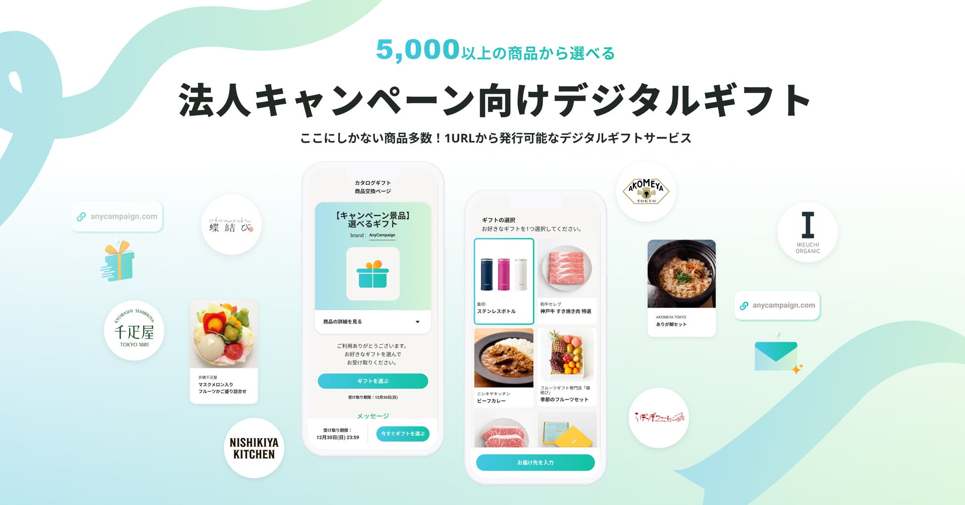 事業内容: eギフト機能を導入できる「AnyGift」の運営、5,000商品から選べるカード型引き出物「AnyGift Wedding」の運営、法人キャンペーン向けデジタルギフト事業「AnyCampaign」の運営