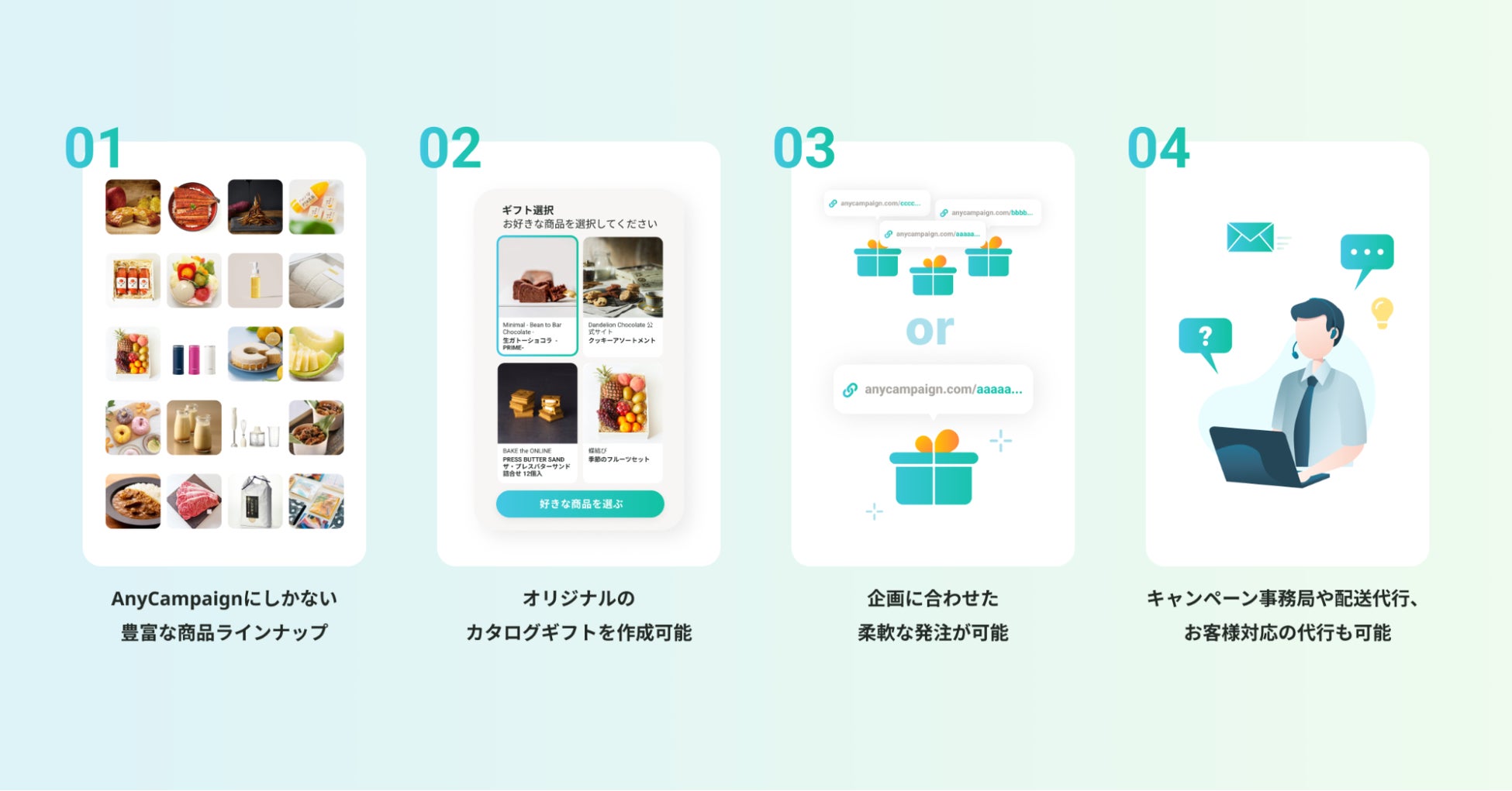 法人間・法人と消費者間における販促活動やキャンペーン等においては、商品の調達や配送の手間が多く残っていたり、いつもAmazonギフト券を景品としてしまうといったマンネリ化などの課題がありました。消費者の方により一層ワクワクするキャンペーンを展開したい、商品を受け取った方が感動して自社ブランドへの好意度を高めていきたい企業様によって、魅力的な商品の数々をデジタルギフト形式でご提供できれば、多くの課題を解決できると思い、AnyCampaignのリリースに至りました。