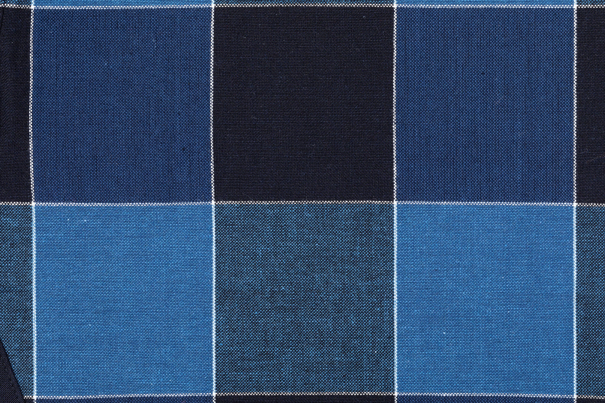 濃淡差のある2種類の紺糸をタテとヨコに配し、一定間隔の升目状に。そこへ白糸の縞が筋状に入ったことで「筋入弁慶」と名付けられた久留米絣の生地で仕上げた古典柄のMONPEです