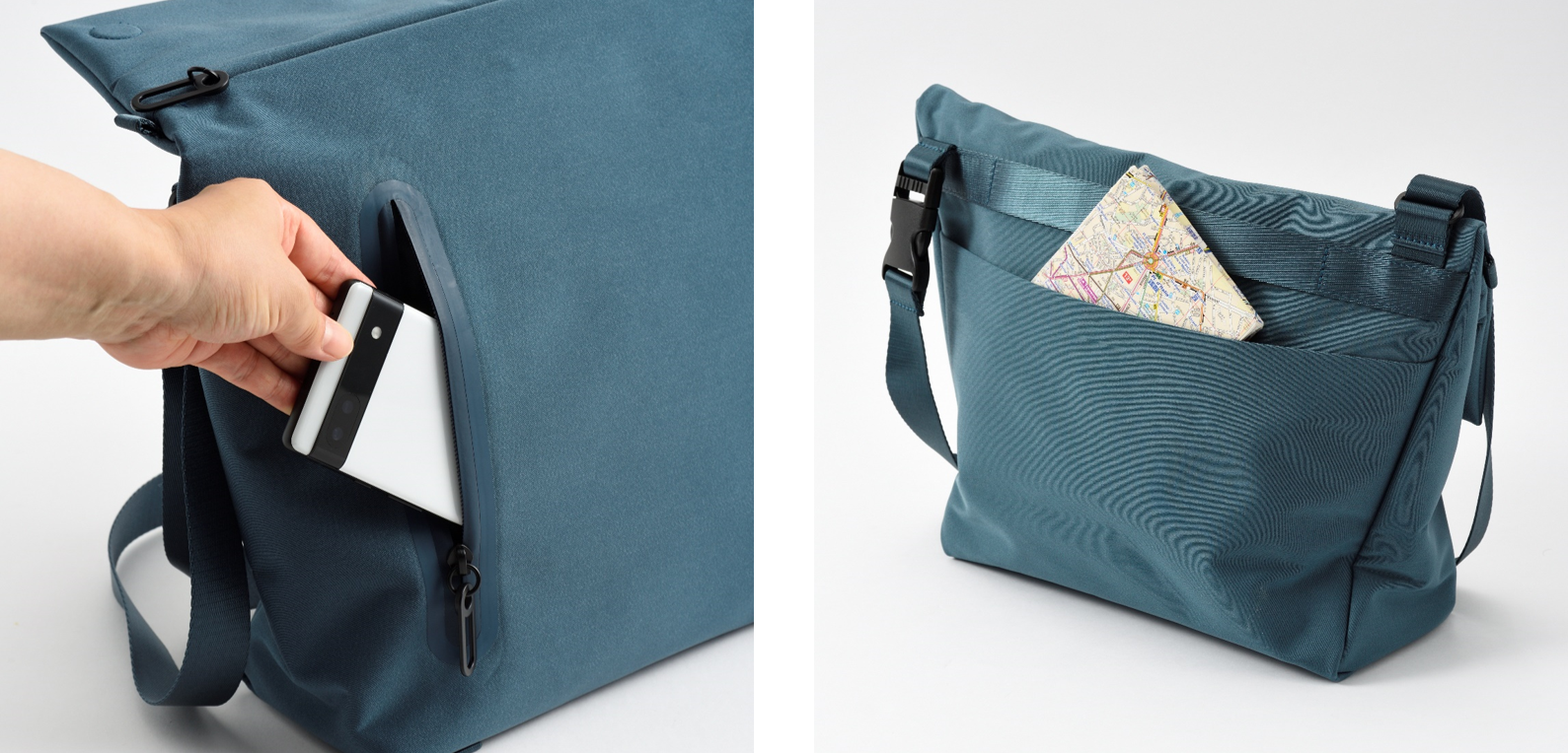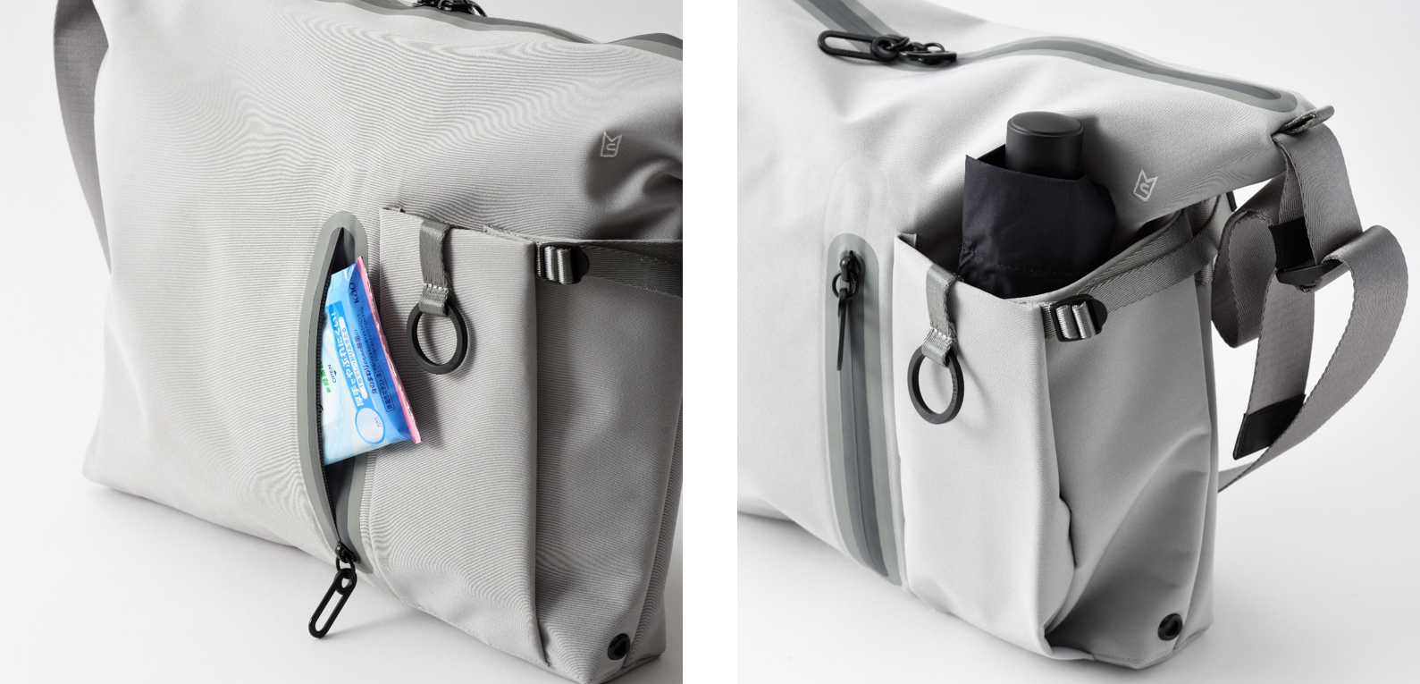すぐに取り出したいものの収納に便利なファスナー付きポケット、ペットボトルや濡れた折りたたみ傘の収納に便利な水抜き穴+アジャスター付きポケットを装備。
